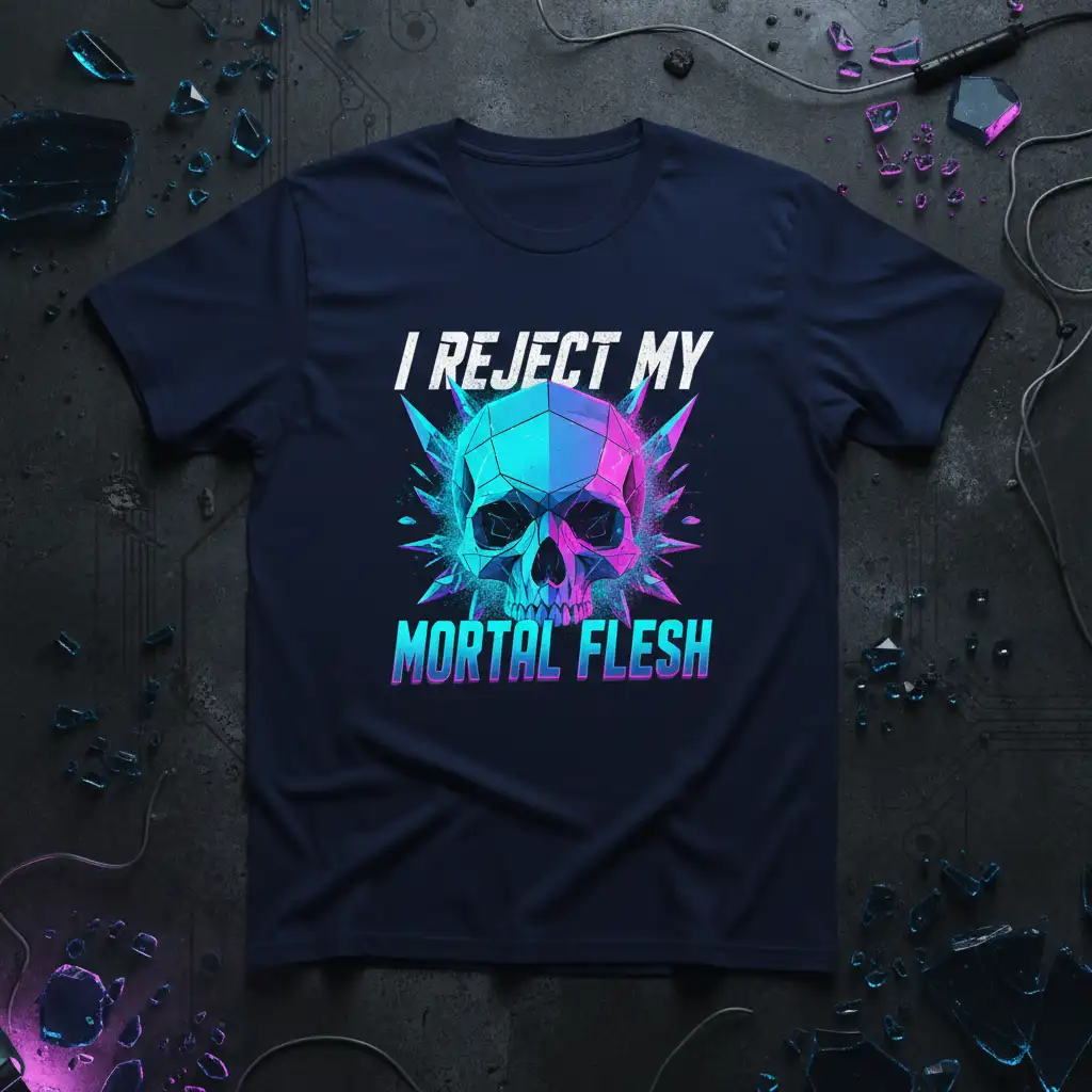 Dive into the world of cyberpunk with this eye-catching tee. The fusion of the skull motif with neon, geometric elements creates a look that is both edgy and sophisticated. This I REJECT MY MORTAL FLESH design taps into the popular appeal of sci-fi and futuristic themes, making it a must-have for enthusiasts. It’s a wearable piece of art that allows you to carry your favorite aesthetic with you throughout the day.