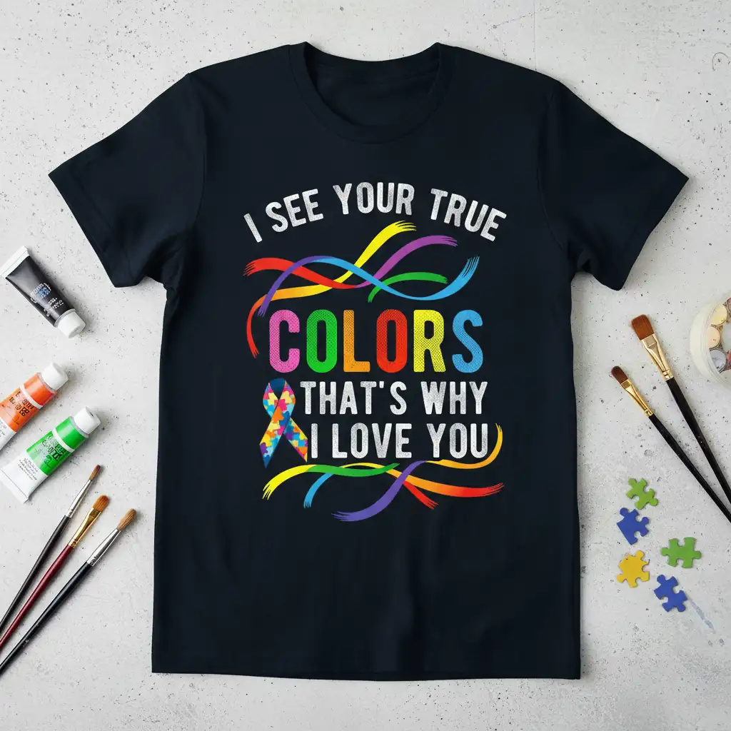 I SEE YOUR TRUE COLORS THAT’S WHY I LOVE YOU on this comfortable and stylish t-shirt is more than just apparel; it’s a statement of love, acceptance, and unwavering support. This design beautifully captures the essence of understanding and celebrating individuality, making it a perfect way to show solidarity with the autism community. Crafted with care, this tee is designed for both comfort and durability, ensuring you can wear your message proudly every day. It’s an ideal choice for awareness events, casual outings, or as a thoughtful gift for a loved one.