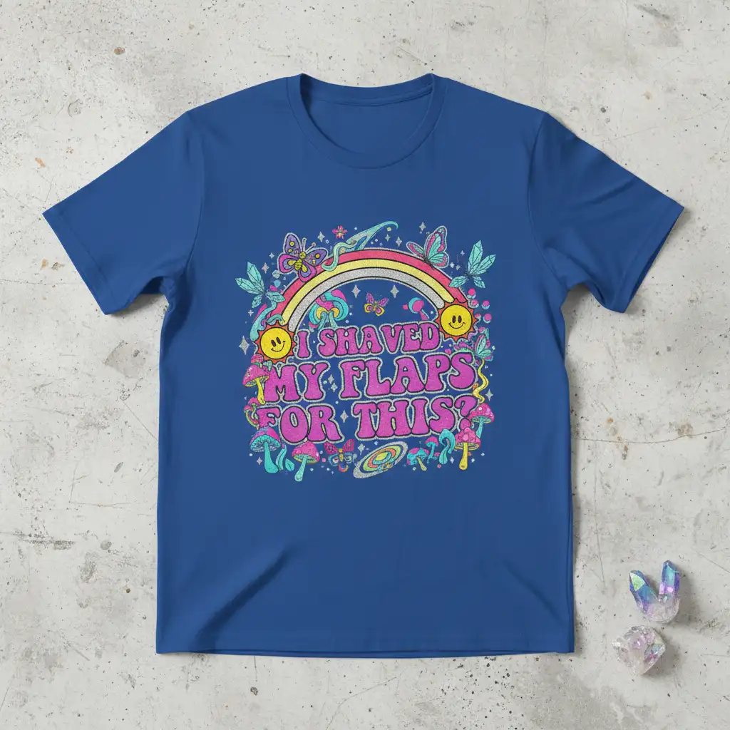 I SHAVED MY FLAPS FOR THIS? This phrase, emblazoned on a vibrant t-shirt, embodies a spirit of bold humor and retro flair. It’s a design that speaks to those who appreciate the unexpected and aren’t afraid to wear their witty sentiments. The eye-catching graphics, featuring psychedelic mushrooms, playful butterflies, and a radiant rainbow, create a visually engaging piece that stands out. This tee is more than just apparel; it’s a statement of personality and a nod to a carefree, groovy aesthetic that resonates with many. It’s perfect for anyone looking to add a unique and conversation-starting item to their collection.