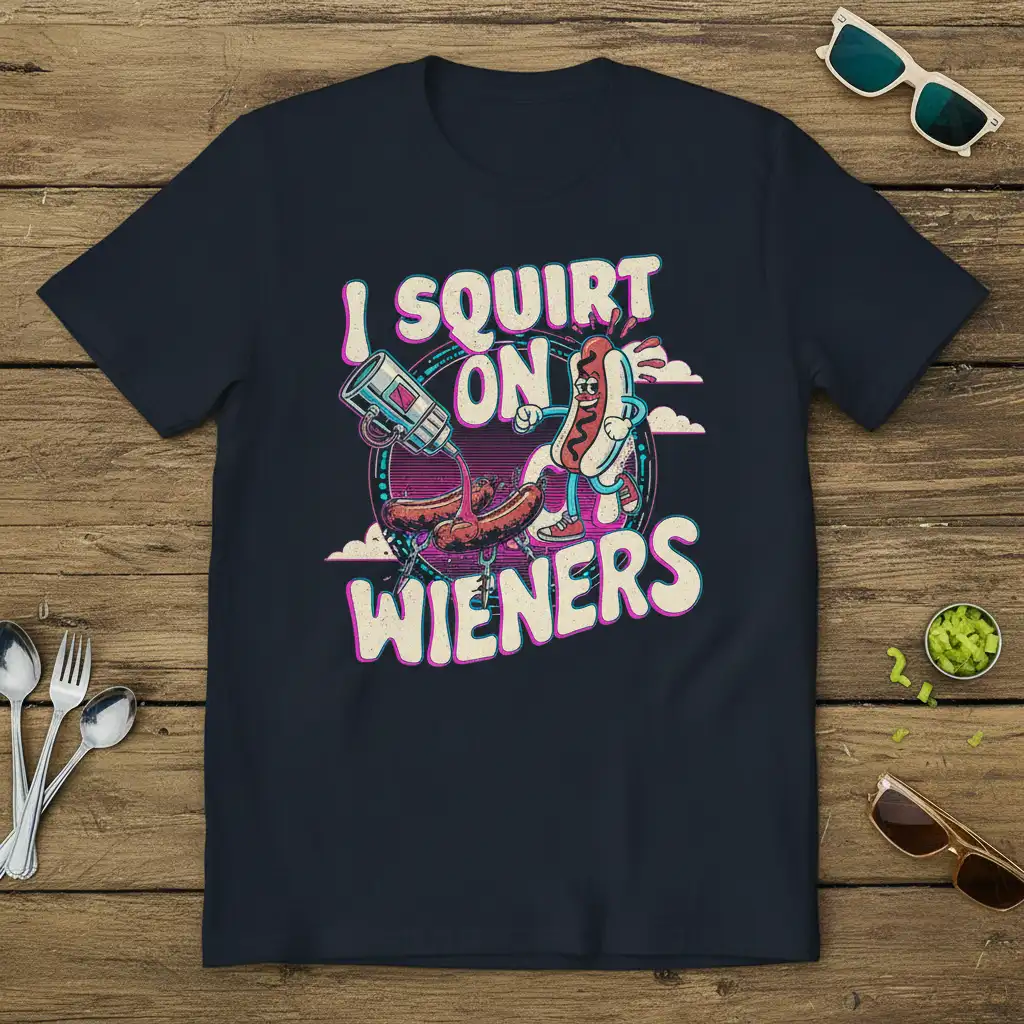Pick from Black, Navy, Royal, Dark Heather, Red, and White to match your mood and wardrobe staples. Each colorway keeps the I SQUIRT ON WIENERS design clear and photo-ready for everyday wear.