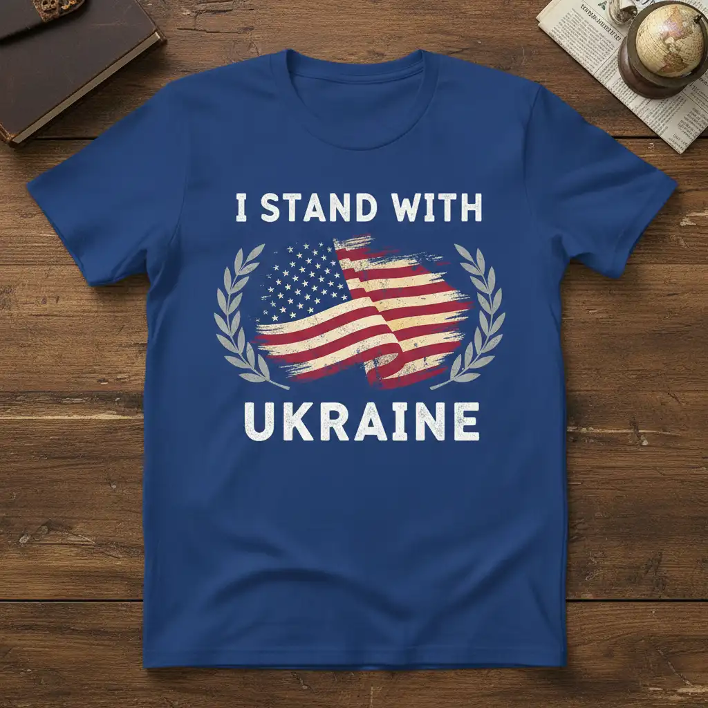 The distressed American flag adds a unique, artistic touch, symbolizing resilience and the enduring spirit of unity. The laurel wreath surrounding the flag further emphasizes honor and respect for the cause. This design is not just a piece of clothing but a wearable declaration of empathy and support for Ukraine during challenging times.