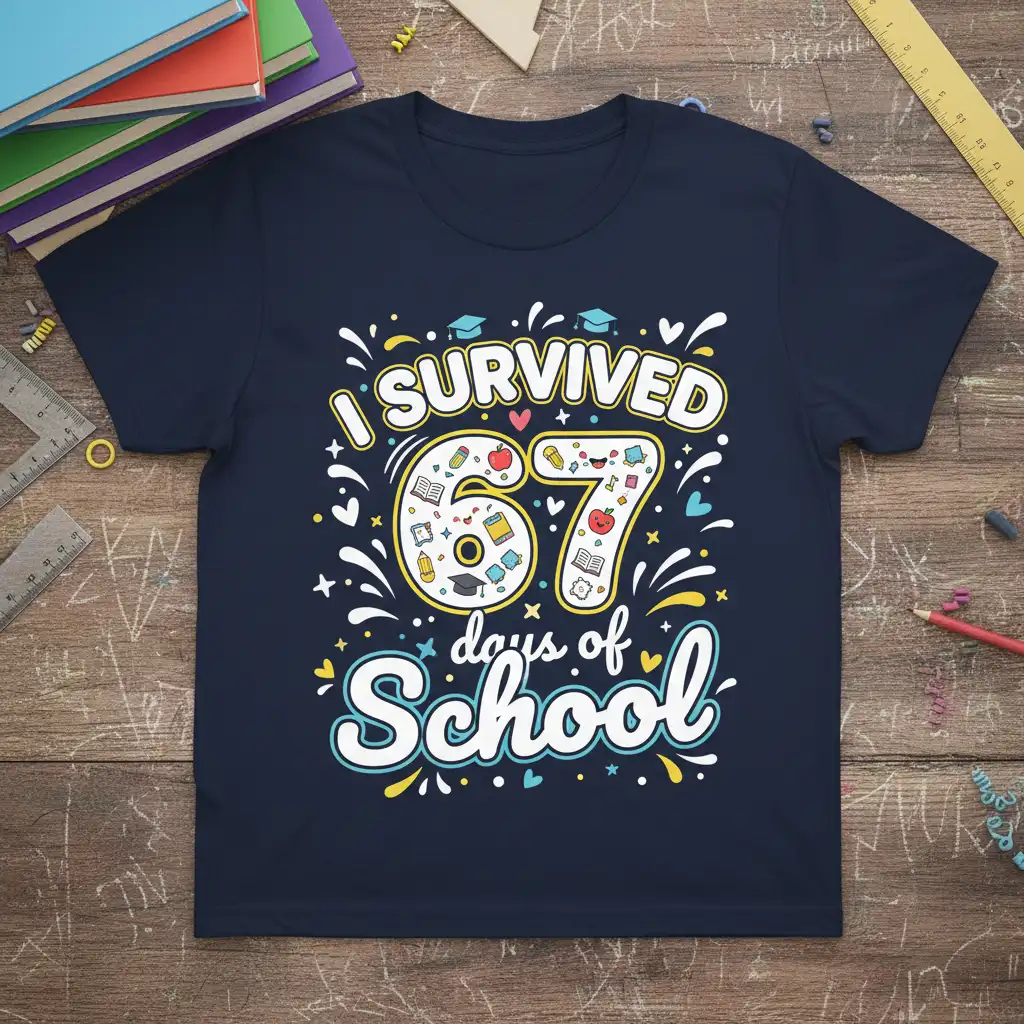 Reaching the 67-day mark in school is a significant accomplishment worthy of celebration. This “I SURVIVED 67 days of School” t-shirt is designed to capture that feeling of victory and relief. The playful typography and cheerful school-themed icons like books, apples, and graduation caps bring the design to life, reflecting the journey of learning and perseverance. It’s a fun way to acknowledge the effort put in by students, teachers, and parents throughout the school year.