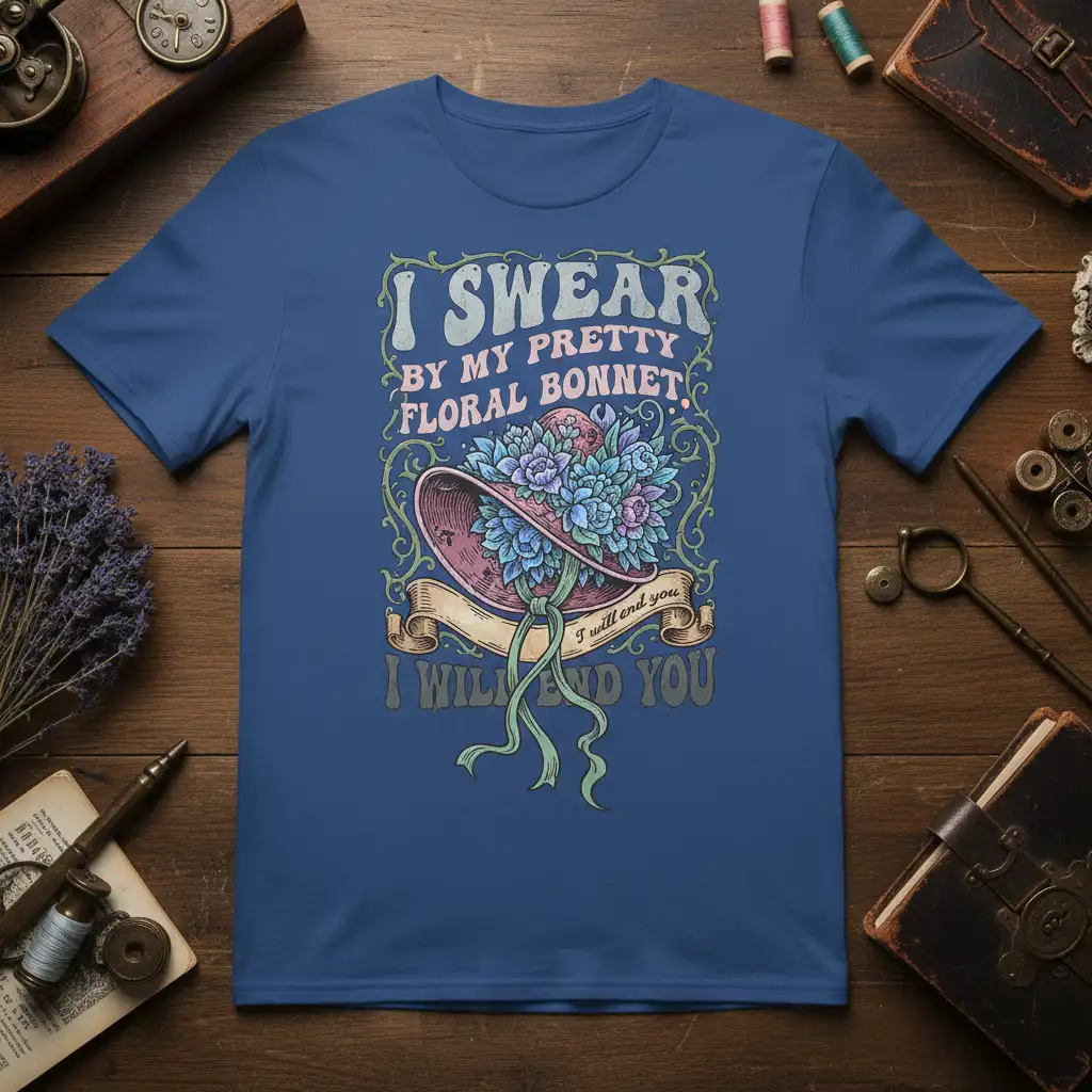 I SWEAR BY MY PRETTY FLORAL BONNET I WILL END YOU is more than just a phrase; it’s a declaration of style and personality. This unique t-shirt captures a sentiment that’s both charmingly vintage and hilariously bold. The intricate design, featuring a beautiful floral bonnet, is sure to turn heads and spark conversations. It’s the perfect way to express your unique sense of humor and appreciation for quirky fashion statements. This apparel is designed for those who aren’t afraid to stand out and make a memorable impression with their clothing choices.