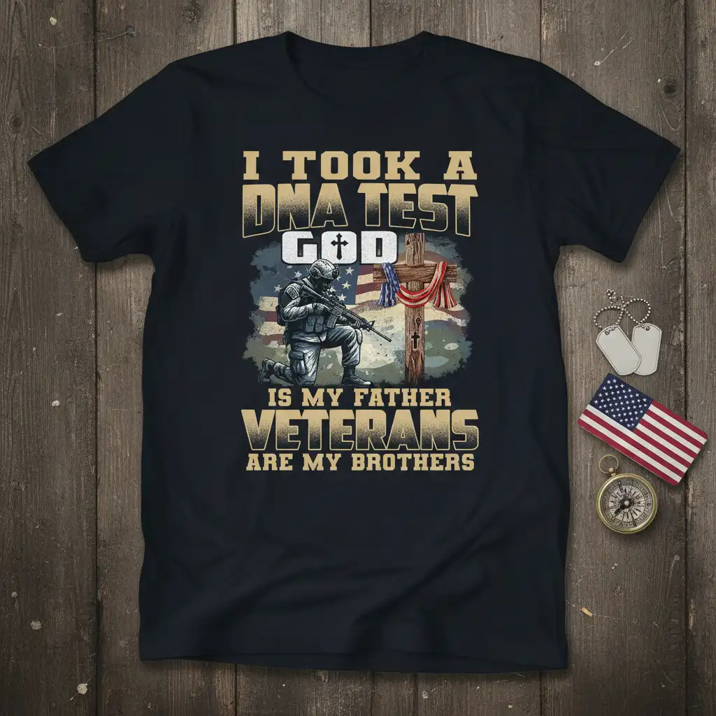 This striking t-shirt prominently displays the empowering message, “I Took A DNA Test God Is My Father Veterans Are My Brothers.” The design features a solemn soldier kneeling before a cross, symbolizing devotion and sacrifice, set against the backdrop of the American flag. It’s a tribute to the deep bonds of faith and the camaraderie that defines military service. This apparel is perfect for expressing your patriotism and spiritual convictions.