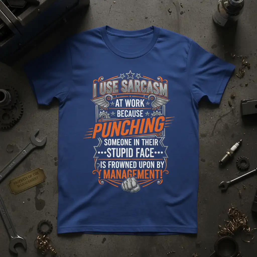 I USE SARCAST AT WORK BECAUSE PUNCHING SOMEONE IN THEIR STUPID FACE IS FROWNED UPON BY MANAGEMENT! — a sentiment that resonates with so many people. I Use Sarcasm At Work Because Punching Someone In Their Stupid Face Is Frowned Upon By Management! This statement tee is designed for those who understand the delicate balance of workplace humor and the subtle art of using sarcasm to navigate daily challenges. It’s a perfect way to express your personality and share a laugh with colleagues who appreciate a good dose of wit.