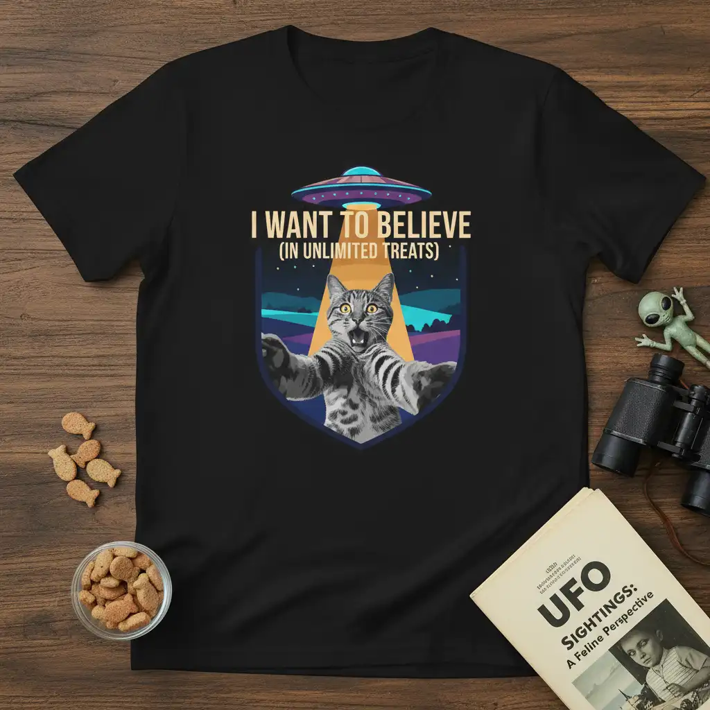 Don’t miss out on this out-of-this-world design that perfectly blends feline fascination with alien intrigue. The “I Want To Believe (In Unlimited Treats)” t-shirt is more than just apparel; it’s a statement of personality, a nod to pop culture, and a celebration of our furry overlords and their endless quest for snacks. Whether you’re buying it for yourself or as a gift, this tee is guaranteed to be a hit. Order yours today and boldly go where no cat has gone before – straight to the treat jar!