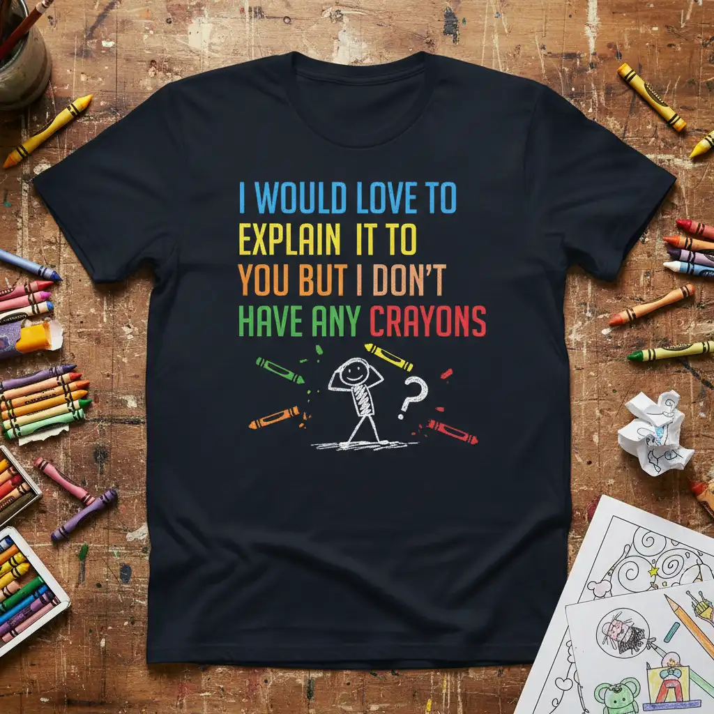 I would love to explain it to you but I don’t have any crayons, and this t-shirt perfectly captures that sentiment with a playful and humorous design. It’s an ideal choice for educators, artists, or anyone who appreciates a good laugh and a touch of wit in their wardrobe. The vibrant text and quirky stick figure graphic make this tee a standout piece. It’s designed to spark conversations and bring smiles wherever you go, making it a fantastic addition for anyone who loves to express their personality through their clothing.