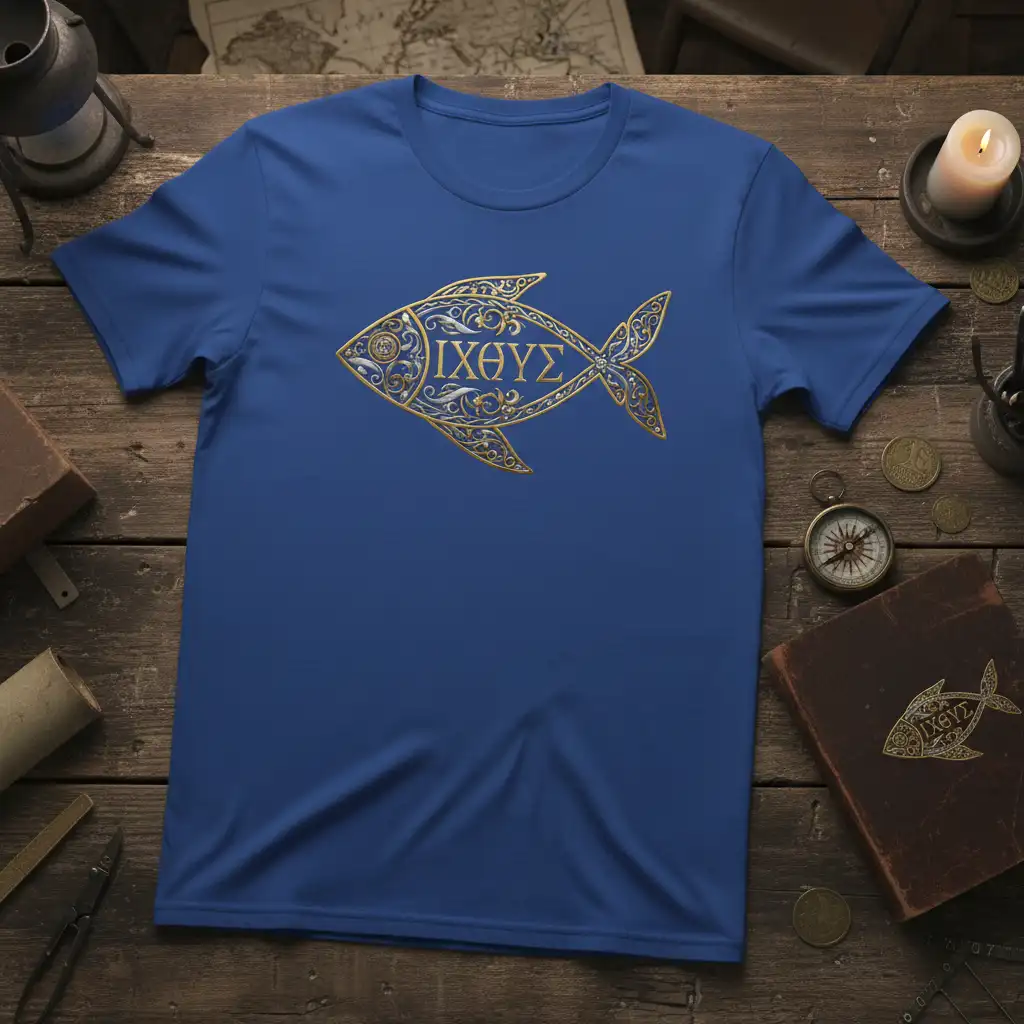 If you adore the elegant golden ΙΧΘΥΣ design, you might also appreciate the inspiring message on the Saved by Grace T-Shirt.