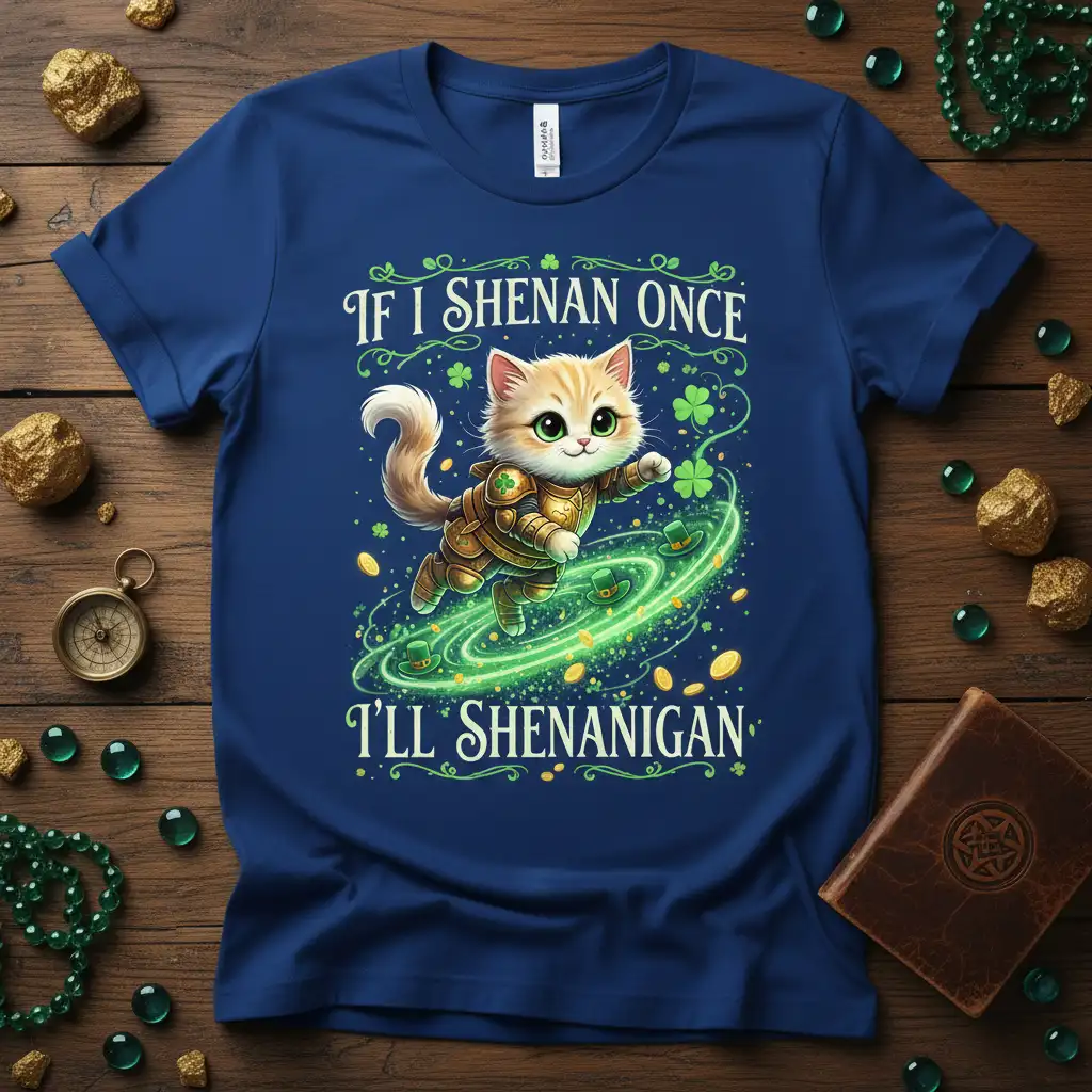 The vibrant green accents and golden highlights on the t-shirt evoke the spirit of luck and prosperity associated with St. Patrick’s Day. The cat’s dynamic pose suggests a readiness for adventure, perfectly matching the holiday’s celebratory atmosphere. This If I Shenan Once I’ll Shenanigan design is printed on high-quality fabric to ensure it remains a favorite in your wardrobe for seasons to come.