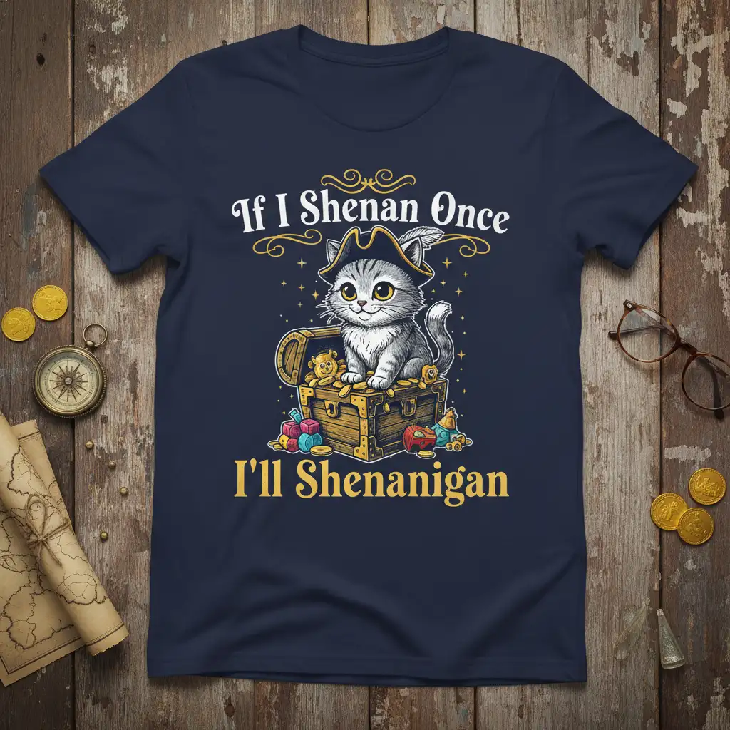 This eye-catching t-shirt features an absolutely adorable pirate cat, complete with a jaunty hat and a mischievous glint in its eye. The cat is nestled amongst a bounty of treasures within a classic wooden treasure chest, symbolizing adventure and hidden delights. The witty phrase “If I Shenan Once I’ll Shenanigan” is perfectly integrated into the design, adding a humorous and relatable touch for all the playful souls out there. It’s a design that speaks volumes about personality and a zest for life.