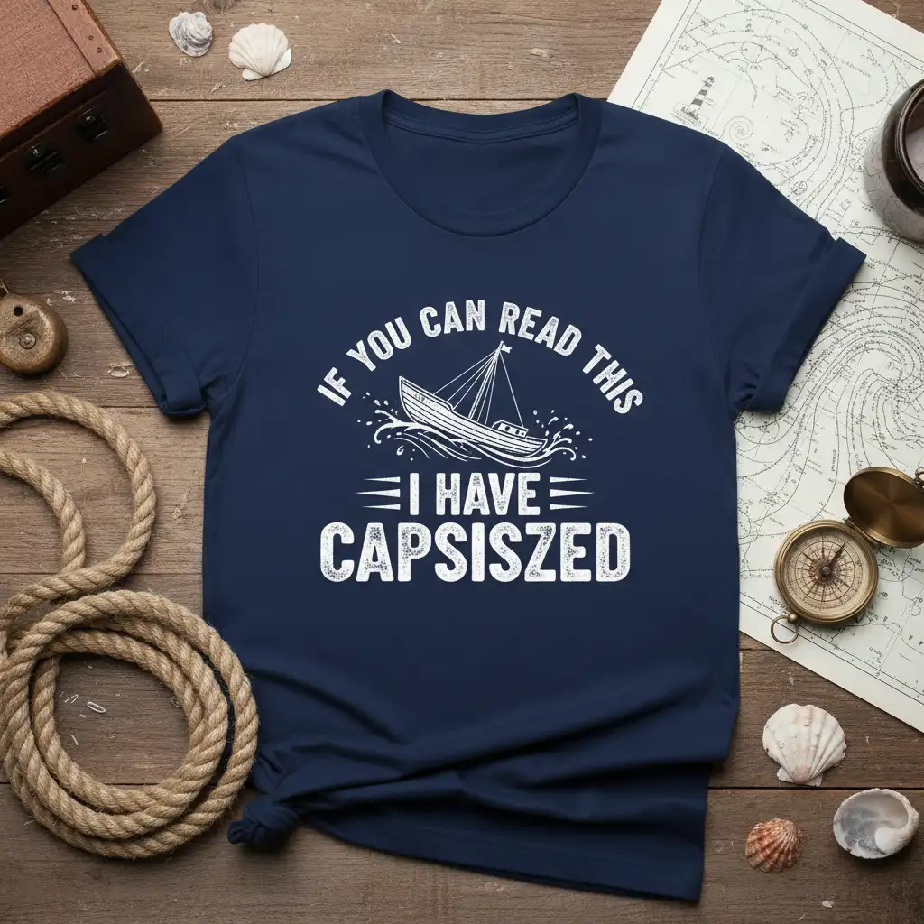 The design features a classic sailboat in motion, surrounded by stylized waves, symbolizing the adventurous spirit of maritime exploration. The bold typography of “IF YOU CAN READ THIS I HAVE CAPSISZED” ensures the message is clear and humorous. This shirt is not just for seasoned captains; it’s for anyone who dreams of the ocean, enjoys boat rides, or simply loves a good nautical joke. It’s a versatile piece that adds a touch of fun to any casual outfit.