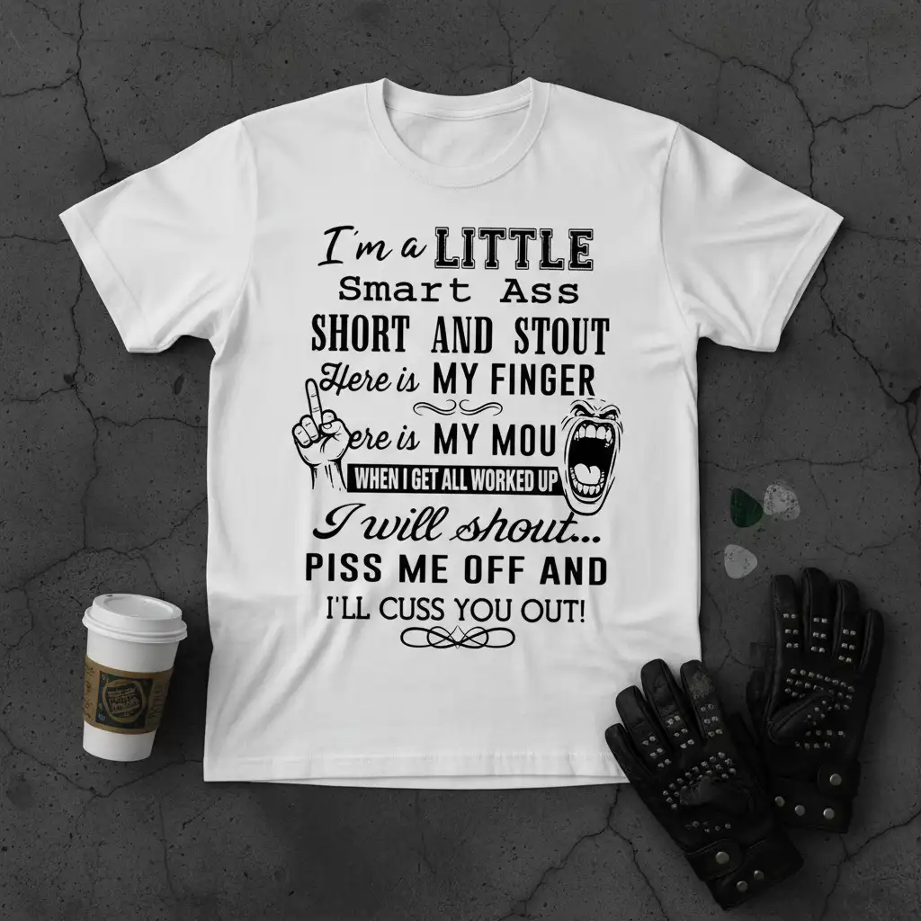 I’m a LITTLE Smart Ass SHORT AND STOUT Here is MY FINGER Here is MY MOU WHEN I GET ALL WORKED UP I will shout… PISS ME OFF AND I’LL CUSS YOU OUT! This t-shirt is designed for those who possess a sharp wit and aren’t afraid to express their feelings when provoked. It’s a bold statement piece that speaks volumes about personality and attitude. The design combines impactful typography with a graphic representation of someone losing their temper, making it a humorous and memorable item. Perfect for anyone who appreciates a good dose of sass and a no-filter approach to communication.