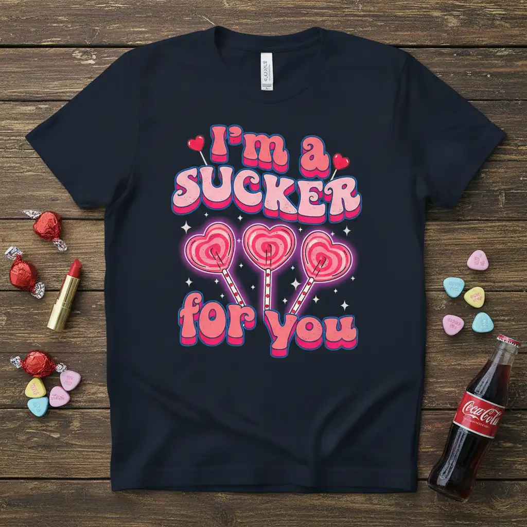 Don’t miss out on the opportunity to own or gift this charming “I’m a Sucker for You” t-shirt. It’s a delightful way to celebrate love and add a touch of sweetness to your wardrobe. The unique retro design and heartfelt message make it an unforgettable item. Order yours today and share the love with this special Valentine’s Day shirt!