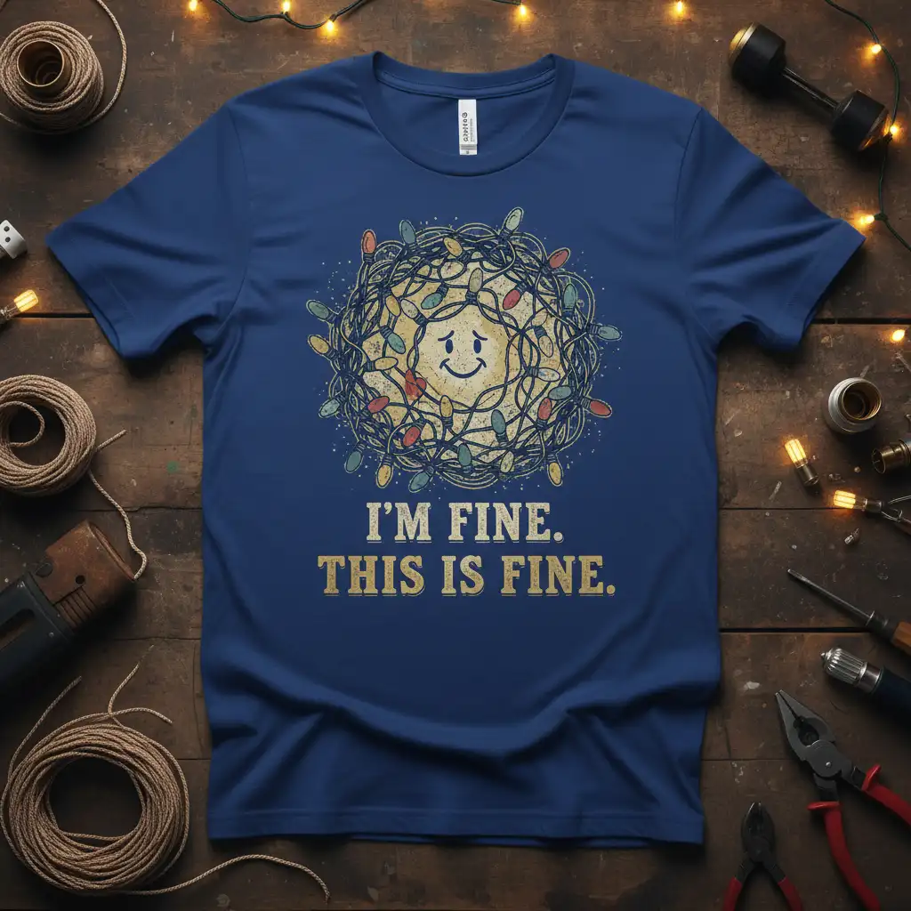 This design showcases a central graphic of a spherical tangle of colorful Christmas lights, each bulb emitting a soft glow. Nestled within this festive chaos is a small, distressed smiley face, its expression a perfect blend of forced optimism and underlying panic. The accompanying text, “I’M FINE. THIS IS FINE.,” is presented in a distressed, vintage-style font that complements the overall aesthetic. It’s a visual representation of navigating holiday stress with a smile, making it a fantastic choice for anyone who appreciates dark humor and relatable holiday scenarios.
