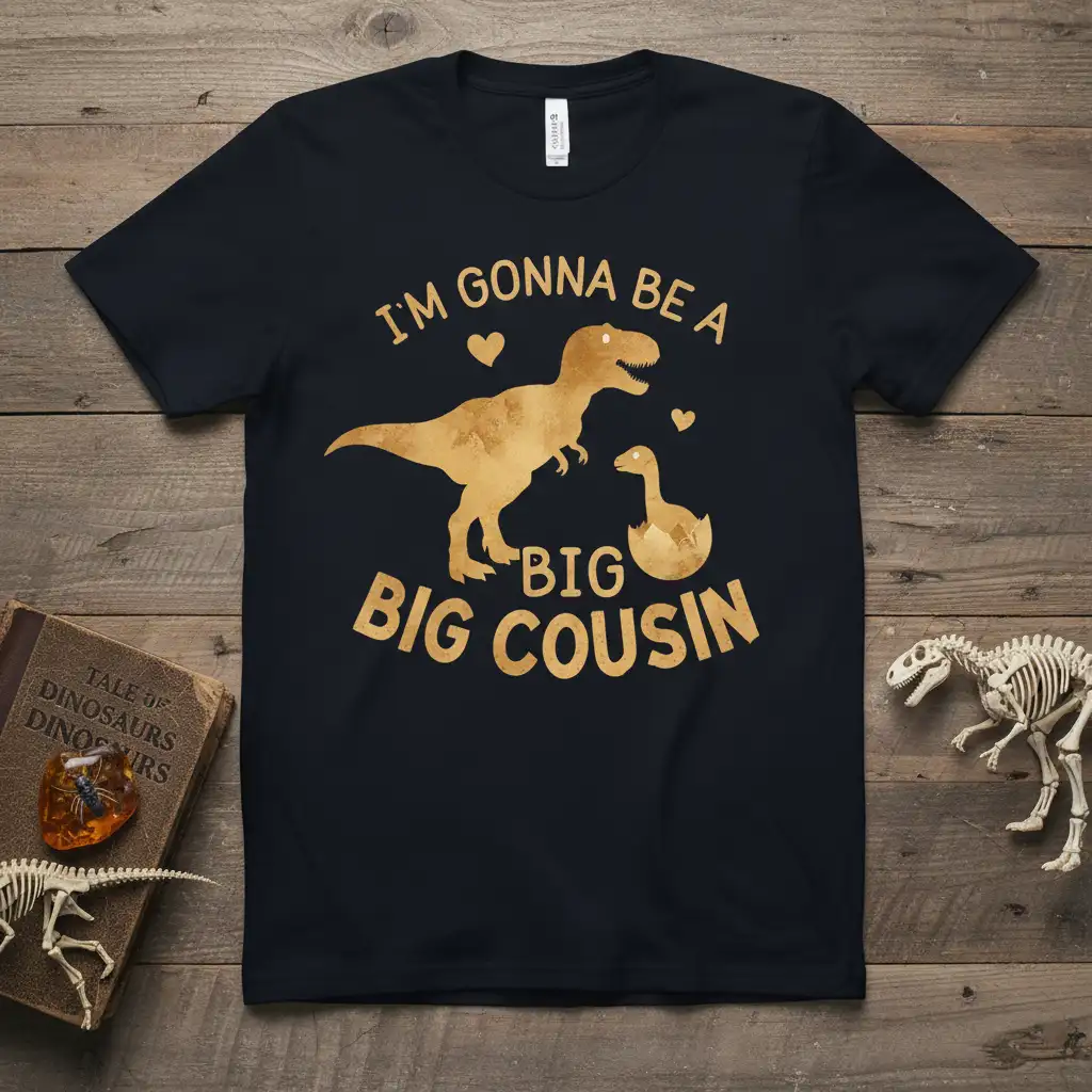 The design features a friendly T-Rex alongside a hatching baby dinosaur, symbolizing the incoming family member. The phrase “I’M GONNA BE A BIG BIG COUSIN” is prominently displayed, ensuring the message is clear and celebratory. This shirt is more than just apparel; it’s a declaration of impending familial joy.