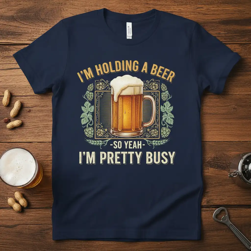 The “I’m Holding A Beer – So Yeah – I’m Pretty Busy” design is a testament to the idea that sometimes, your primary focus should be on enjoying the moment. It’s an invitation to relax, unwind, and celebrate the enjoyment that a good beer brings.