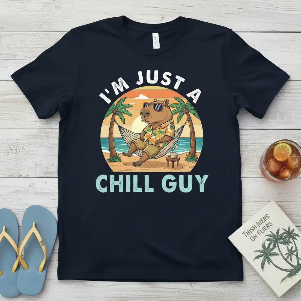 I’m Just A Chill Guy, the ultimate statement for anyone who lives life at a relaxed pace. This t-shirt captures the serene essence of a capybara enjoying the simple pleasures of a tropical paradise, complete with palm trees and a gentle ocean breeze. It’s more than just apparel; it’s a wearable declaration of your commitment to unwinding and embracing a carefree attitude. Perfect for casual outings, beach days, or just lounging around, this design brings a touch of sunny escapism to your everyday wardrobe. Get ready to spread those chill vibes wherever you go.