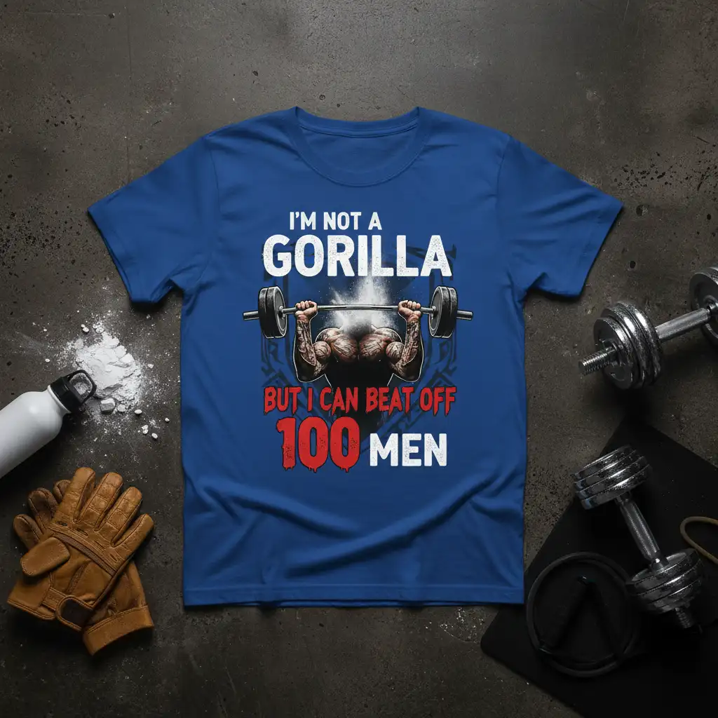 I’m Not A Gorilla But I Can Beat Off 100 Men, this bold statement t-shirt is designed for the ultimate fitness enthusiast who appreciates a good laugh along with their serious dedication. It’s more than just apparel; it’s a badge of honor for those who push their limits in the gym. The striking graphic and humorous quote are sure to turn heads and spark conversations among fellow gym-goers, making it a standout piece in any workout wardrobe. This tee embodies the spirit of strength, perseverance, and a touch of playful bravado that defines the modern athlete.