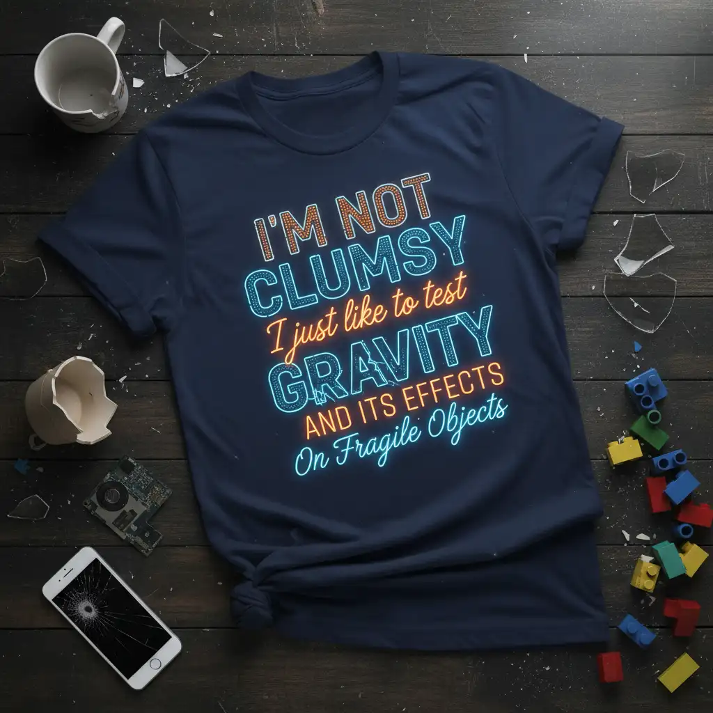 This t-shirt is designed for those who believe that clumsiness is simply a matter of perspective. The bold lettering and neon-like effect of the design make a strong visual statement, mirroring the impactful nature of gravity itself. It’s a witty way to explain those unexpected tumbles or dropped items, turning potential embarrassment into a badge of honor for the scientifically curious.