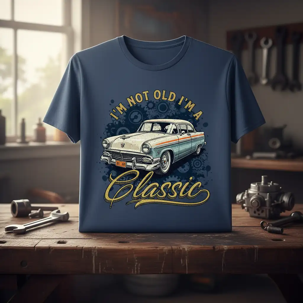 Don’t just admire classic cars, wear the sentiment! This “I’m Not Old I’m A Classic” t-shirt is a must-have for any collector, hobbyist, or admirer of vintage automotive excellence. Its unique design and comfortable fit make it an everyday essential for expressing your passion. Click to add this timeless piece to your cart and join the ranks of those who know that true classics are ageless. Embrace your inner classic and let the world know your vintage car appreciation is timeless.