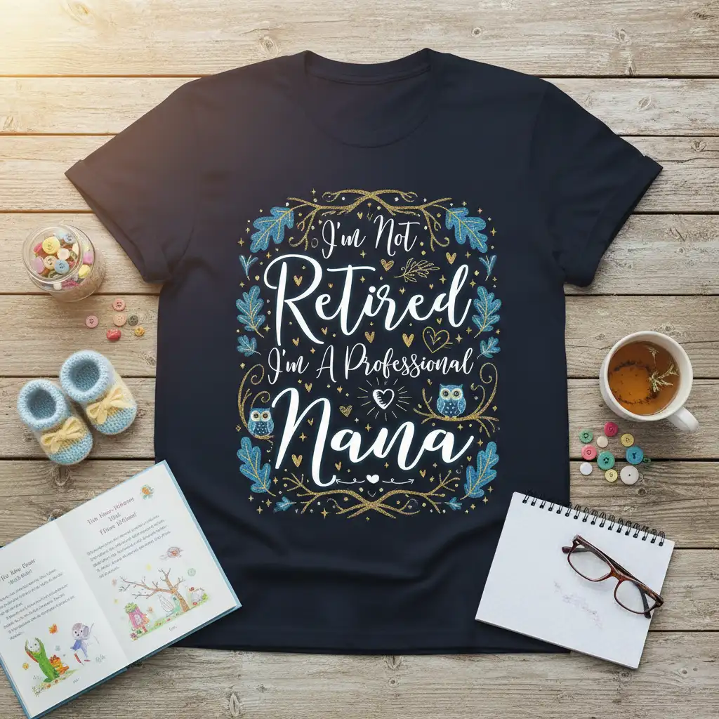The design itself is a beautiful blend of artistic elements and heartfelt messaging. The swirling script of “I’m Not Retired” and “I’m A Professional Nana” is beautifully complemented by the whimsical owls and delicate floral accents, creating a look that is both sophisticated and charming. It’s a piece that speaks volumes about the wearer’s personality and her cherished role.