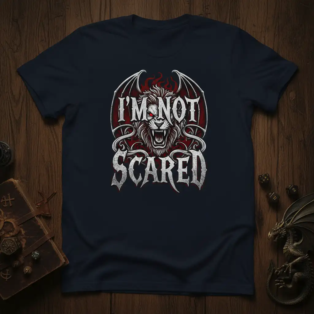 This “I’m Not Scared” t-shirt is more than just apparel; it’s a symbol of fortitude and a testament to the power of facing your fears head-on. The central design showcases a majestic lion, a creature renowned for its courage and strength, amplified by the addition of dramatic bat wings. This fantastical element adds a touch of dark allure and supernatural power to the graphic. The striking contrast between the fiery red accents and the stark white lettering against the dark fabric makes this design pop, ensuring it captures attention and sparks conversation. It’s an ideal choice for those who appreciate bold imagery and powerful messages.