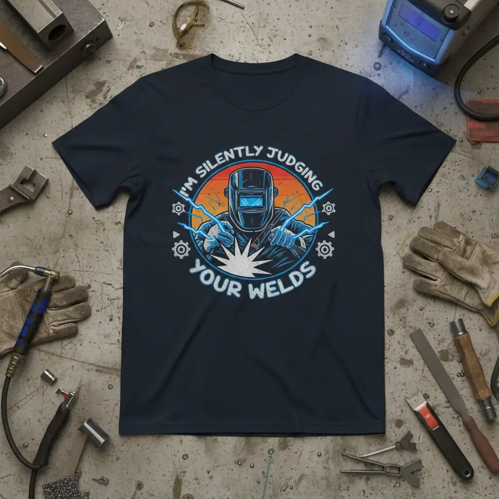 This I’M SILENTLY JUDGING YOUR WELDS design’s appeal extends beyond just the immediate profession; it speaks to anyone who appreciates craftsmanship, skill, and a bit of dry humor. It’s a versatile piece that can be worn in various settings, from casual outings to industry events, always making a statement about the wearer’s connection to the welding world.