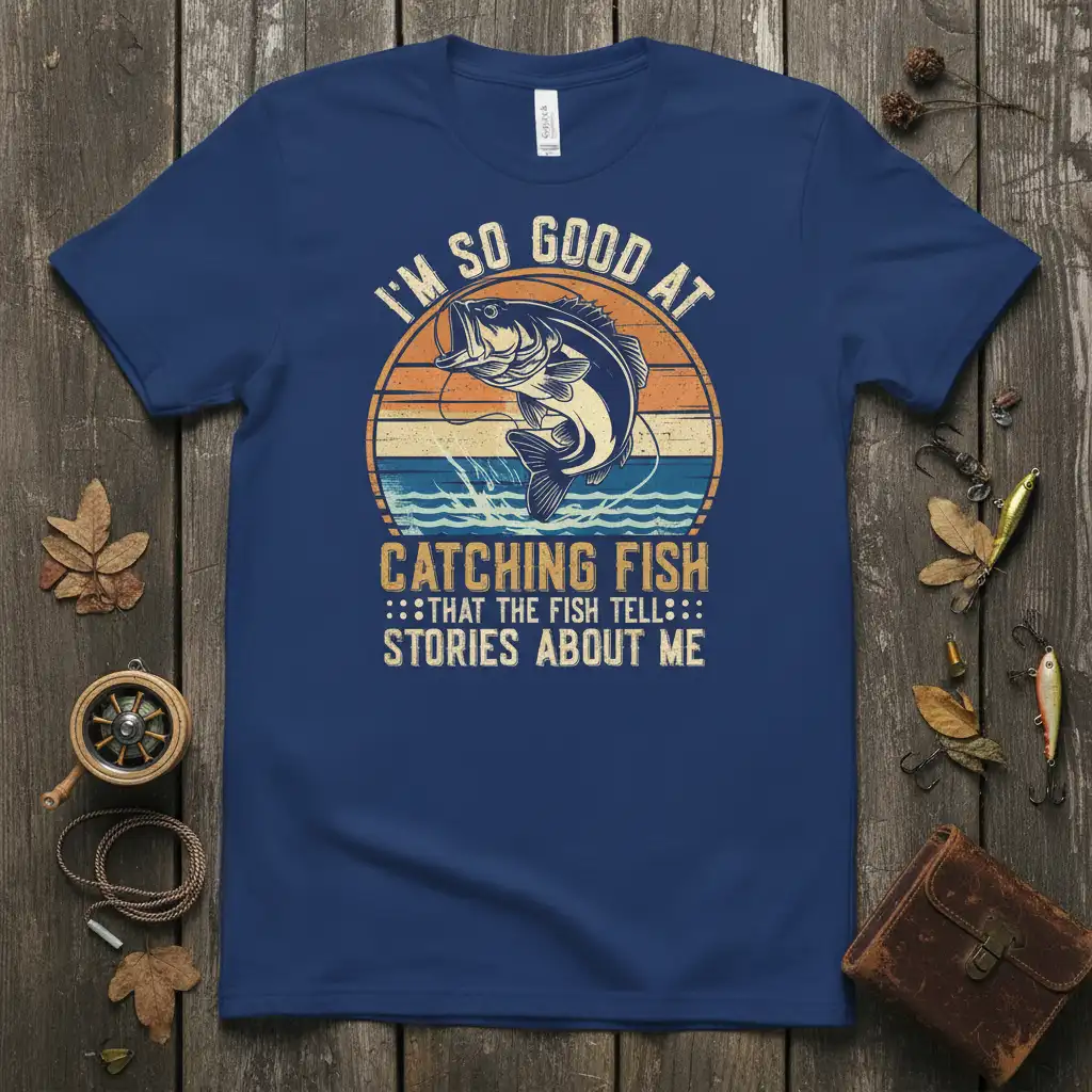 I’M SO GOOD AT CATCHING FISH :::THAT THE FISH TELL::: STORIES ABOUT ME, and this t-shirt is the perfect way to broadcast your legendary status. Designed for the avid angler who loves to tell a tall tale, this tee combines humor with a striking graphic that’s sure to turn heads at the lake, river, or fishing convention. It’s more than just apparel; it’s a declaration of your supreme angling skills and your place in fishing folklore. Get ready to hook compliments and laughter with this unique piece.