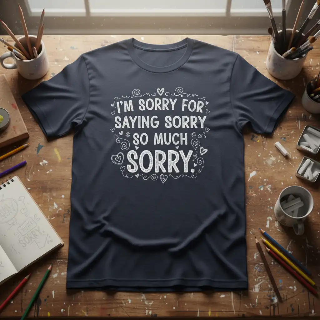 I’M SORRY FOR SAYING SORRY SO MUCH SORRY. This phrase, rendered in a charming, hand-drawn style, perfectly captures that relatable feeling of over-apologizing with a humorous twist. It’s designed for those who appreciate a good laugh at themselves and love to wear their personality. This tee is more than just apparel; it’s a conversation starter and a statement piece for anyone with a witty sense of humor and a fondness for playful self-deprecation.