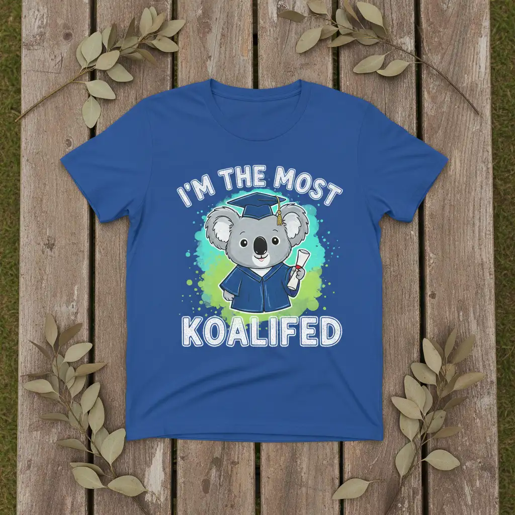 Celebrate your graduation day in style with this charming “I’m The Most Koalified” t-shirt. The design features a lovable koala, dressed in a graduation cap and gown, proudly holding a diploma. This playful pun combines the excitement of graduation with the adorable imagery of a koala, making it a perfect memento of your academic achievements.