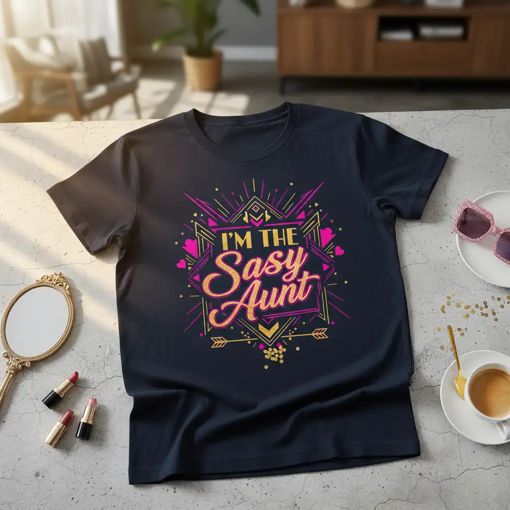 I’M THE Sasy Aunt. This statement t-shirt is designed for the aunt who brings the sparkle, the fun, and a whole lot of personality to the family. It’s more than just apparel; it’s a declaration of your fabulous status as the coolest aunt around. The eye-catching design, featuring a blend of glittery fonts and vibrant colors, ensures you’ll stand out in any crowd. It’s the perfect way to celebrate your unique bond with your nieces and nephews and showcase your sassy spirit. This tee is a testament to the special role aunts play, filled with laughter, love, and a touch of fabulousness.