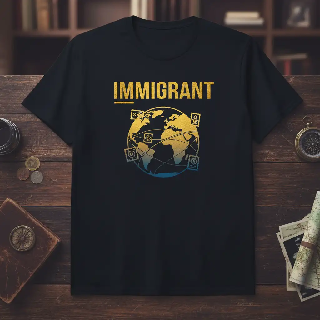 This striking t-shirt features the word “IMMIGRANT” in a bold, eye-catching gold font, immediately conveying a sense of pride and belonging. The design is further enhanced by a beautifully rendered globe, transitioning from a warm gold to a cool blue, symbolizing the vastness of the world and the connections forged through travel and migration. This visual metaphor speaks to the interconnectedness of humanity and the shared experiences of people worldwide.