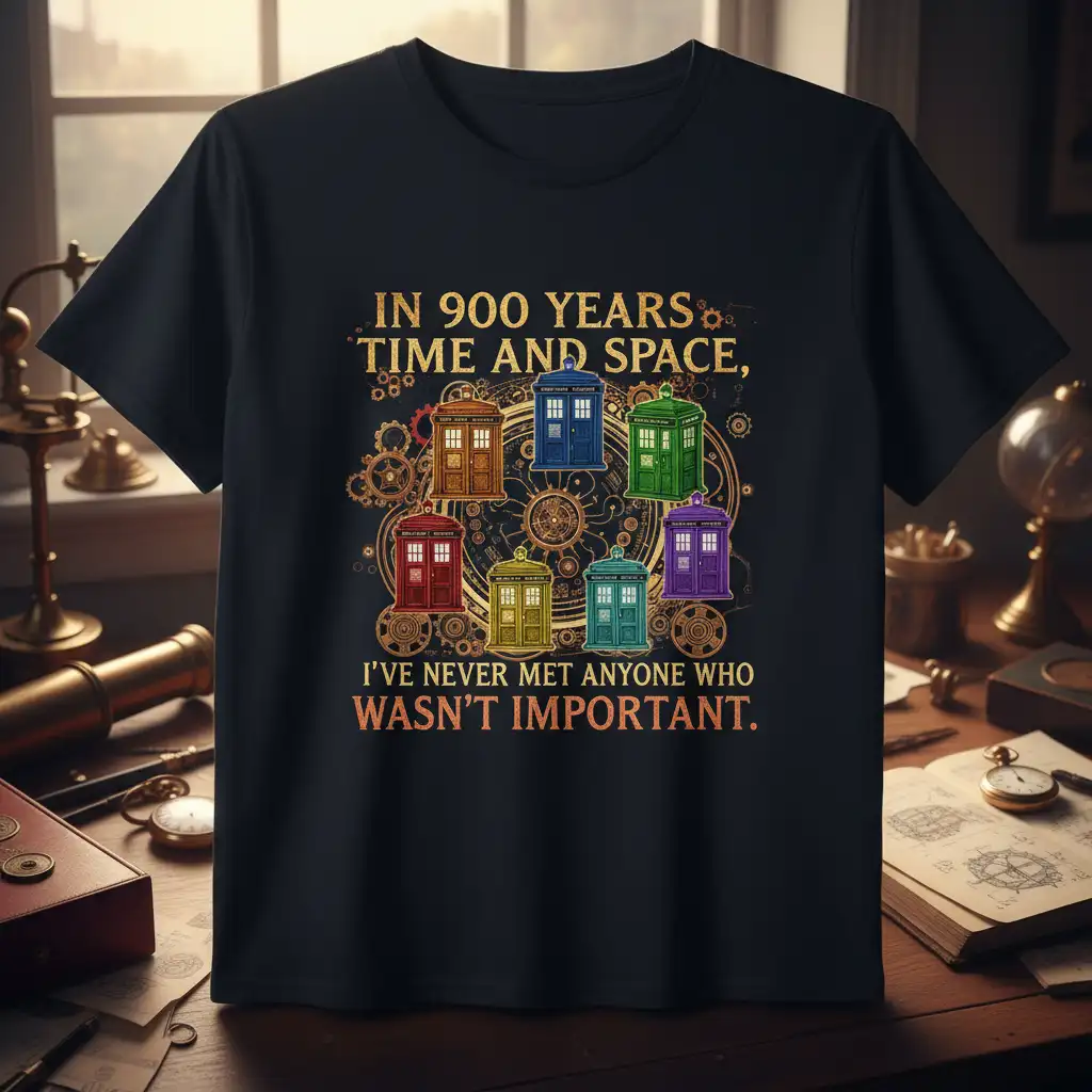 The artistic execution of the TARDISes and steampunk gears is remarkable, capturing the intricate details that fans love. The quote, “In 900 Years Time And Space, I’ve Never Met Anyone Who Wasn’t Important,” is rendered in a clear, impactful font that commands attention. This t-shirt is a testament to thoughtful design and quality craftsmanship, ensuring it becomes a favorite piece in your collection.