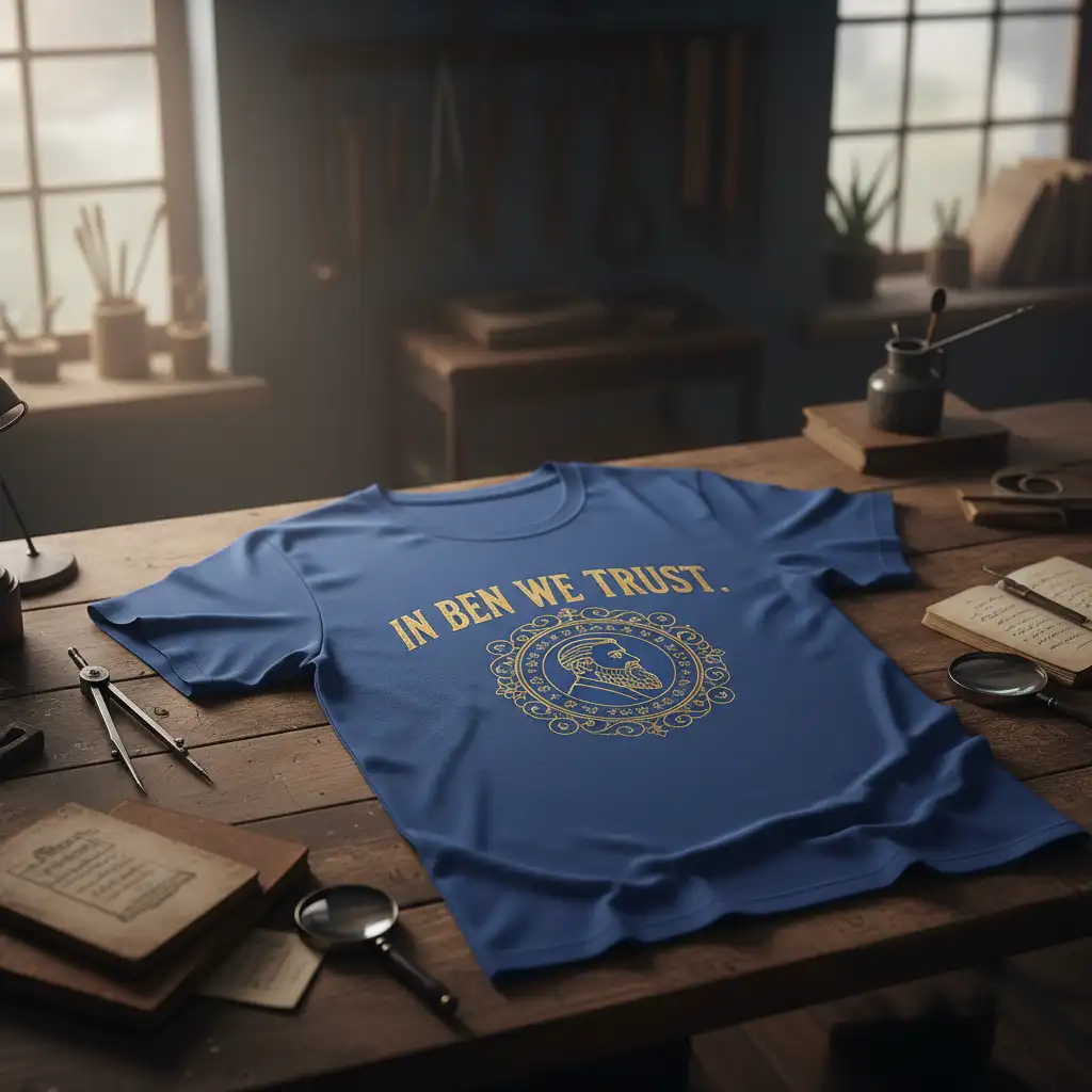 The “In Ben We Trust” design is meticulously crafted to stand out, combining a classic aesthetic with a modern appeal. It’s perfect for wear during national holidays, historical reenactments, or simply as a daily reminder of the enduring spirit of American innovation and resilience. This IN BEN WE TRUST. design is a testament to the thoughtful design and cultural resonance that makes a piece of clothing truly special and memorable for the wearer and onlookers alike.