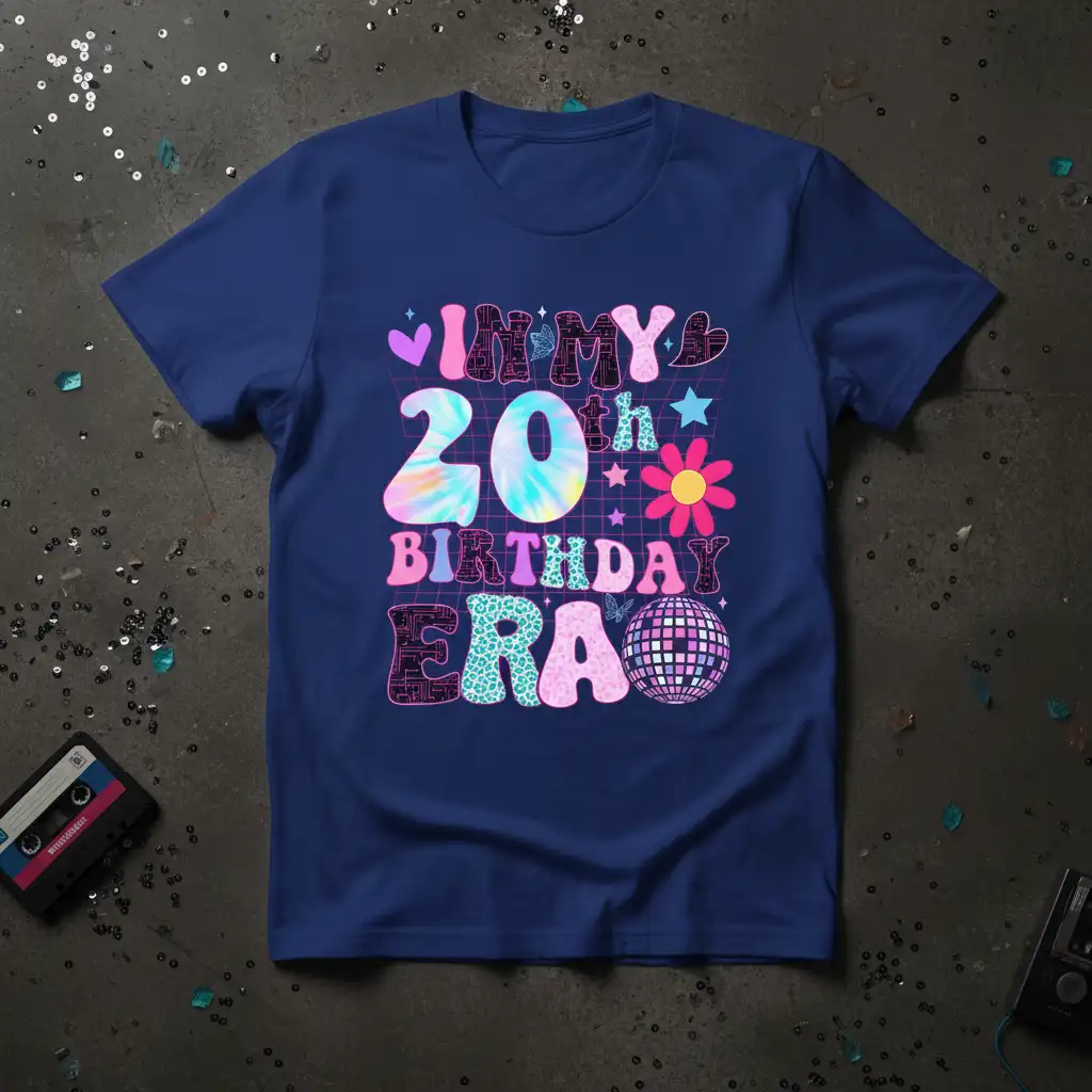 Celebrate your milestone birthday in unforgettable style with the “In My 20th Birthday Era” t-shirt. This vibrant design is crafted for those ready to embrace their twenties with enthusiasm and flair. Featuring a dynamic mix of tie-dye, leopard print, disco balls, and playful graphics, it’s the perfect statement piece for any birthday celebration. Get ready to make lasting memories in an outfit that truly reflects your festive spirit.