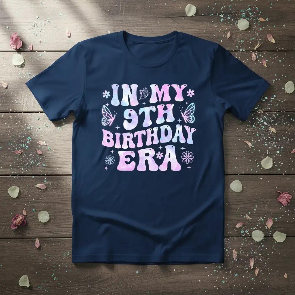 Finding the perfect outfit for a ninth birthday can be a delightful challenge, and this “In My 9th Birthday Era” t-shirt fits the bill perfectly. It combines a fun, fashionable aesthetic with the celebratory theme of a birthday. The pastel colors and butterfly motifs add a touch of magic and wonder, appealing to the imagination of any nine-year-old girl. This tee is versatile enough to be dressed up with a skirt or worn casually with shorts or jeans, making it a staple for her birthday wardrobe.