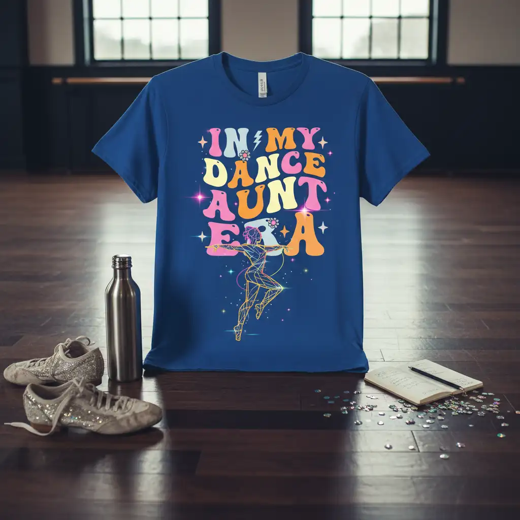 Pick from Black, Navy, Royal, Dark Heather, Red, and White to match your mood and wardrobe staples. Each colorway keeps the IN MY DANCE AUNT ERA design clear and photo-ready for everyday wear.