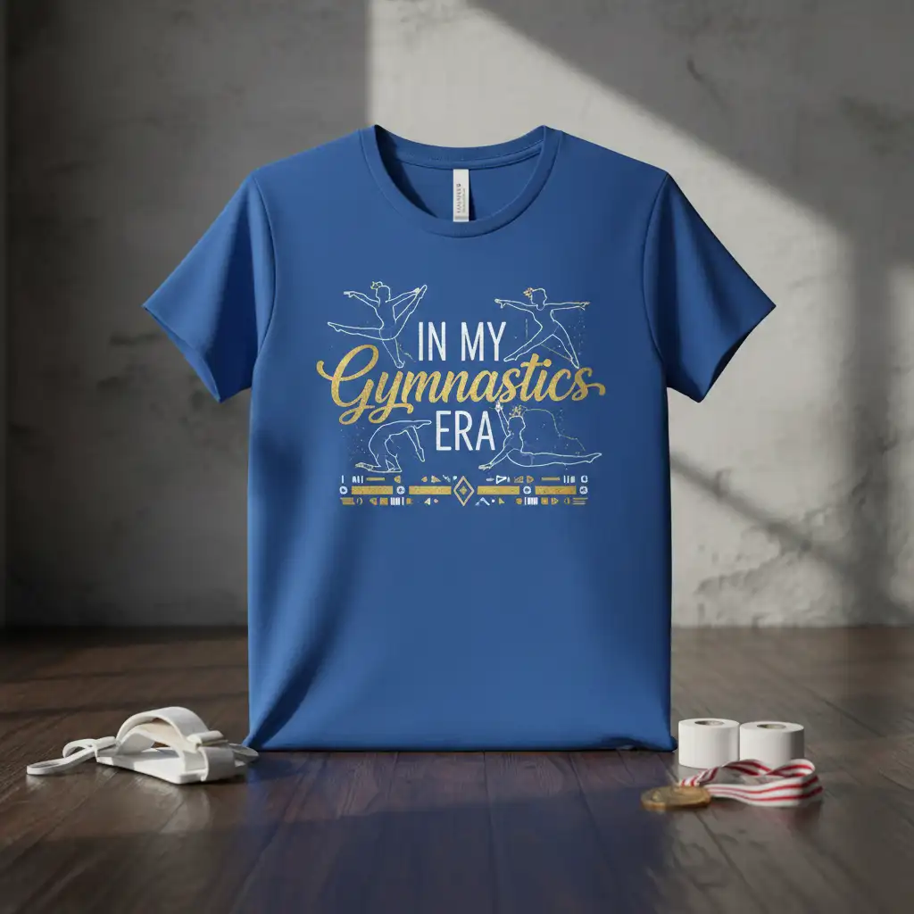 This unique t-shirt captures the essence of a gymnast’s journey, from the early stages of learning new skills to mastering complex routines. The design features dynamic silhouettes of gymnasts in action, surrounded by elegant typography that proudly proclaims “IN MY Gymnastics ERA.” It’s a visual representation of the focus, discipline, and sheer joy that comes with dedicating yourself to gymnastics.