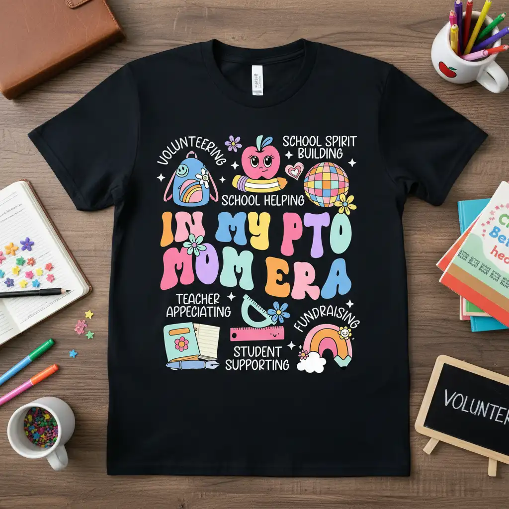 This In My PTO Mom Era design thoughtfully incorporates key aspects of PTO work, including “Volunteering,” “School Spirit Building,” “School Helping,” “Teacher Appreciating,” “Fundraising,” and “Student Supporting.” Each element is represented with charming graphics and playful typography, making the shirt visually engaging and meaningful.