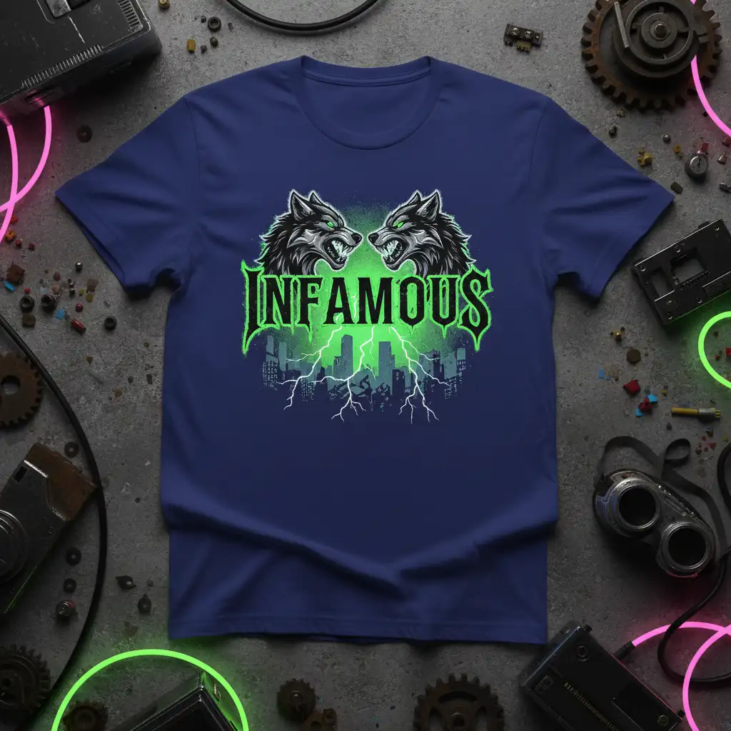 This t-shirt showcases a powerful design centered around the word “INFAMOUS” in a distinctive gothic font. The lettering itself is captivating, drawing the eye with its intricate details and luminous green glow. Flanking the text are two fierce wolf heads, their eyes glowing with an intense, almost supernatural light, conveying a sense of raw power and untamed spirit.