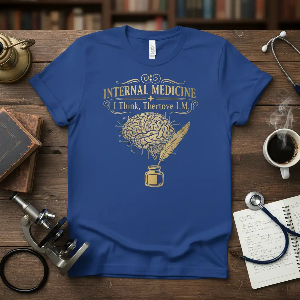 INTERNAL MEDICINE I Think, Thertove I.M. This unique t-shirt is designed for those who understand the dedication and intellectual rigor involved in internal medicine. Featuring a striking brain graphic intertwined with circuitry and a classic quill pen, this design symbolizes the blend of complex science and thoughtful practice that defines the specialty. It’s more than just apparel; it’s a statement piece that resonates with medical professionals, students, and anyone who appreciates the intricate world of internal medicine. The elegant gold design stands out on the rich blue fabric, making it a stylish and meaningful addition to any wardrobe. This shirt is a perfect way to express pride and passion for the medical field.