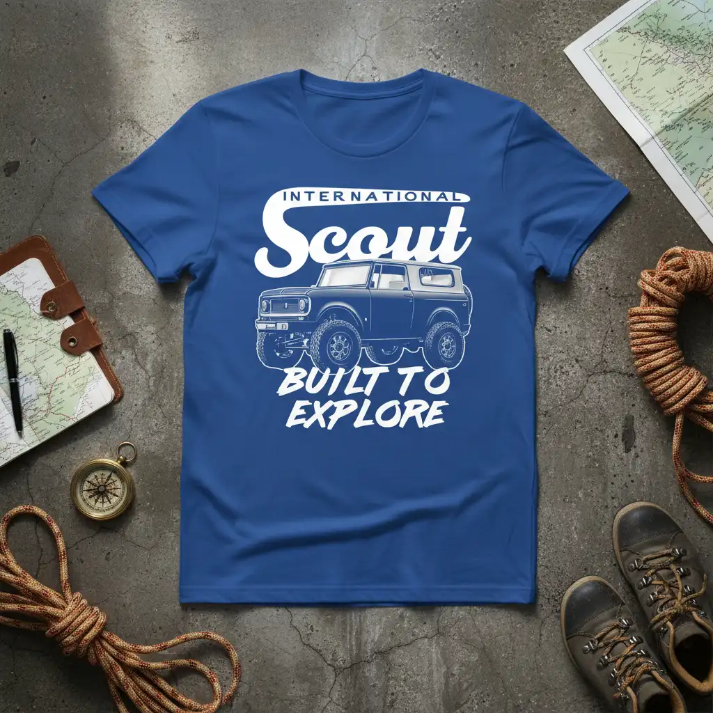 INTERNATIONAL Scout BUILT TO EXPLORE. This iconic phrase embodies the spirit of adventure and the rugged capability of a legendary vehicle. Our premium t-shirt captures this essence, making it the perfect apparel for anyone who lives for the open road and uncharted territories. Crafted for comfort and durability, this tee is more than just clothing; it’s a statement of your passion for exploration and classic automotive history. Wear it proudly on your next journey or as a daily reminder of the freedom that comes with hitting the trail.