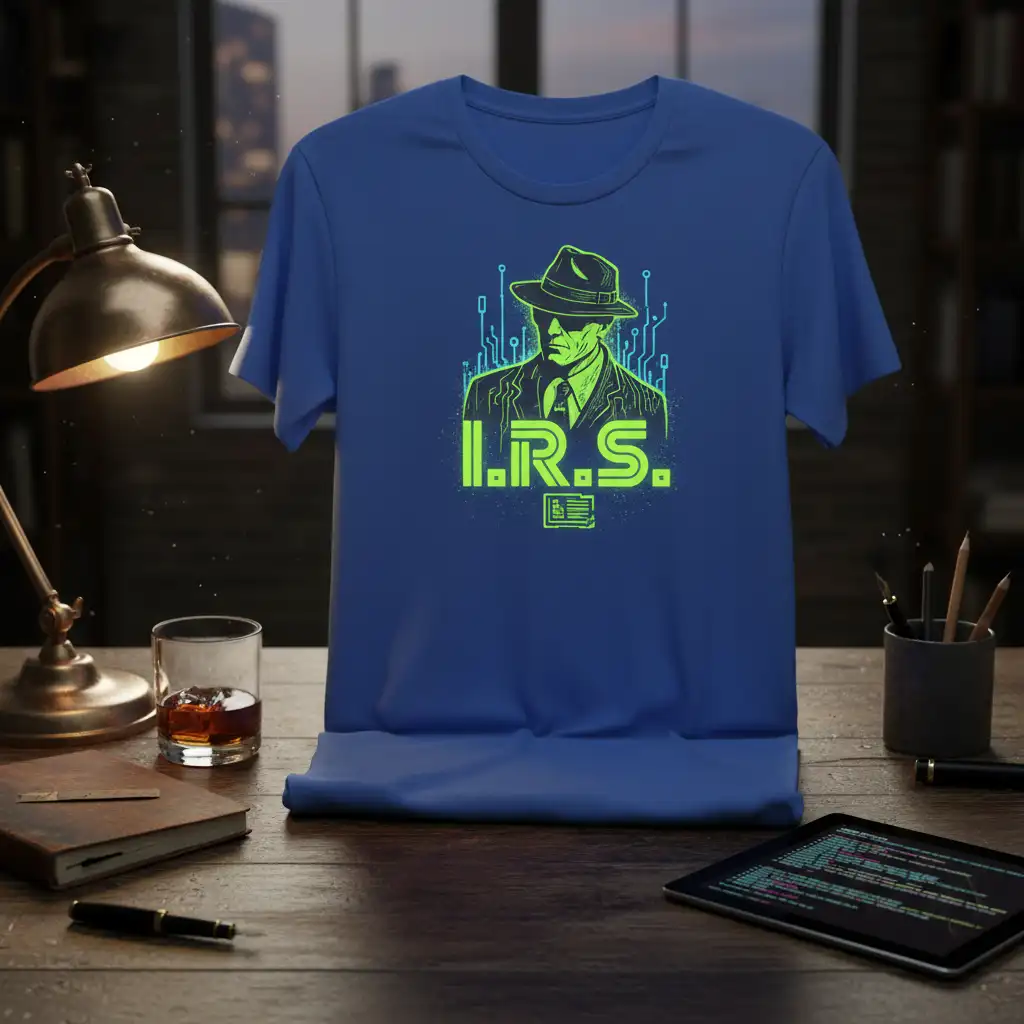 This eye-catching tee proudly displays the iconic “I.R.S.” text in a striking neon green, accompanied by a stylized illustration. The graphic features a distinguished gentleman in a fedora and suit, interwoven with intricate digital circuit board patterns, symbolizing the intersection of traditional bureaucracy and modern technology. It’s a design that speaks volumes to accountants, tax preparers, and anyone navigating the complexities of tax season.