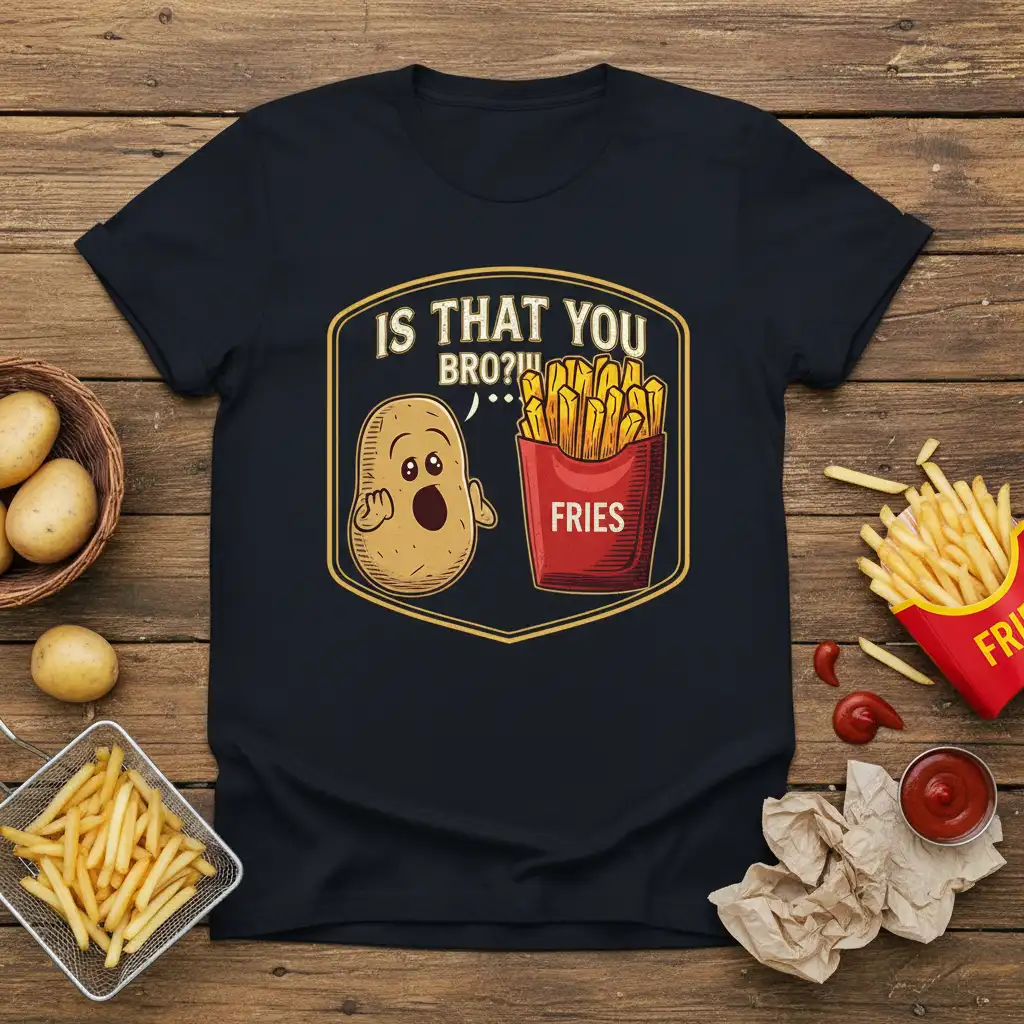 This graphic tee features a charming potato character expressing surprise with the text “IS THAT YOU BRO?!!!”, standing next to a box of classic french fries. The design is enclosed within a decorative frame, adding a touch of vintage flair. It’s a fantastic conversation starter and a must-have for anyone who enjoys playful food-themed apparel and clever wordplay.