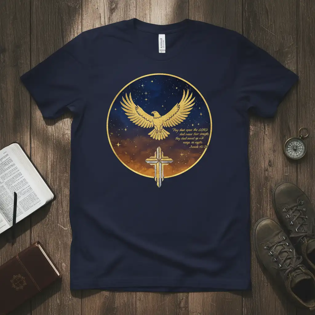They that wait upon the LORD shall renew their strength; they shall mount up with wings as eagles; Isaiah 40:31. This profound verse is beautifully captured on our premium t-shirt, offering a daily dose of inspiration and a powerful declaration of faith. The design features a majestic golden eagle, symbolizing soaring strength and divine empowerment, set against a celestial backdrop. Below it, a striking cross serves as a constant reminder of hope and redemption, making this shirt a wearable testament to spiritual resilience. It’s more than just apparel; it’s a statement of belief and a source of encouragement for every wearer.