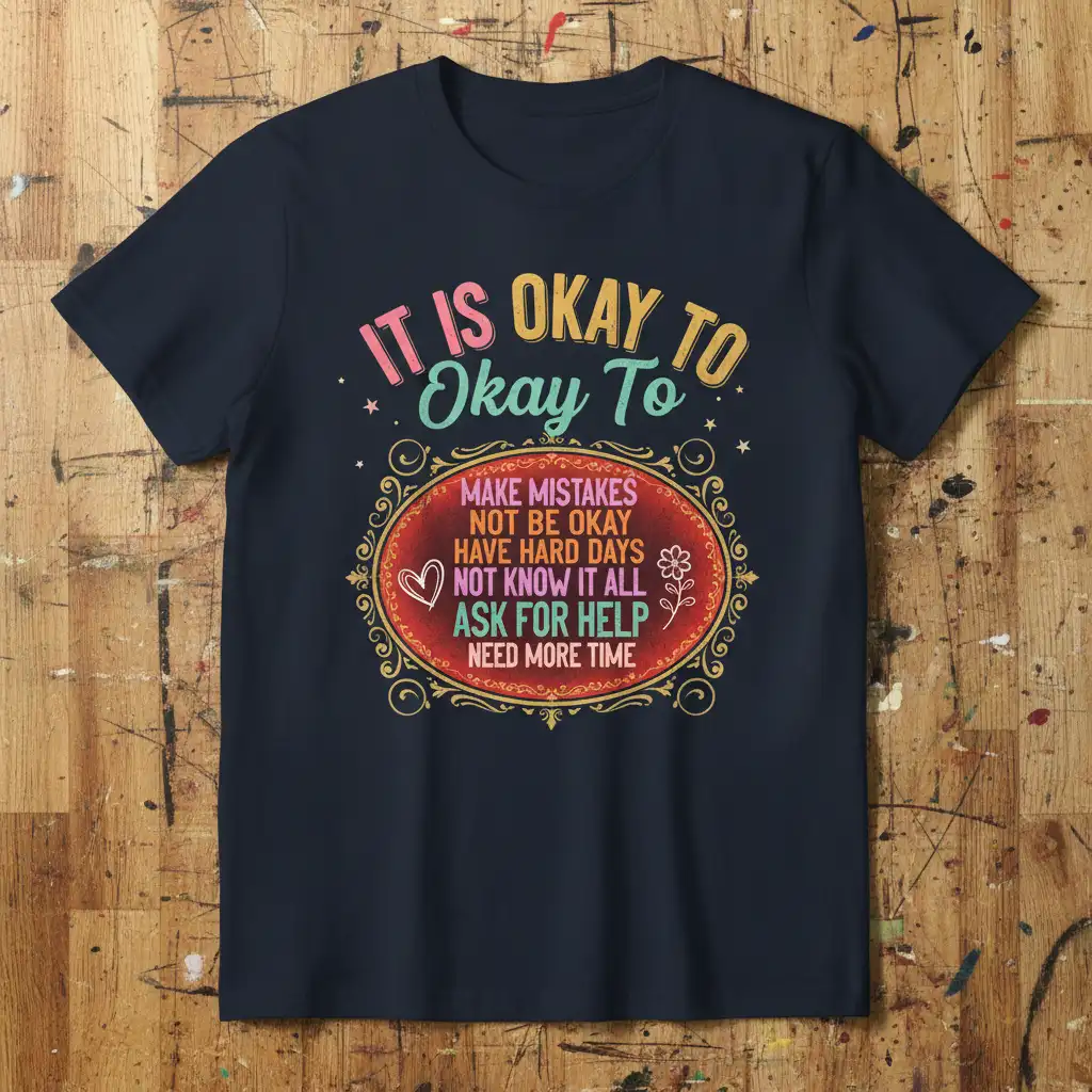 This shirt proudly displays the message, “IT IS OKAY TO Okay To MAKE MISTAKES NOT BE OKAY HAVE HARD DAYS NOT KNOW IT ALL ASK FOR HELP NEED MORE TIME.” It’s more than just apparel; it’s a statement of self-acceptance and a gentle nudge towards healthier coping mechanisms. The design thoughtfully encapsulates the idea that vulnerability is a strength, and reaching out for help is a sign of courage.