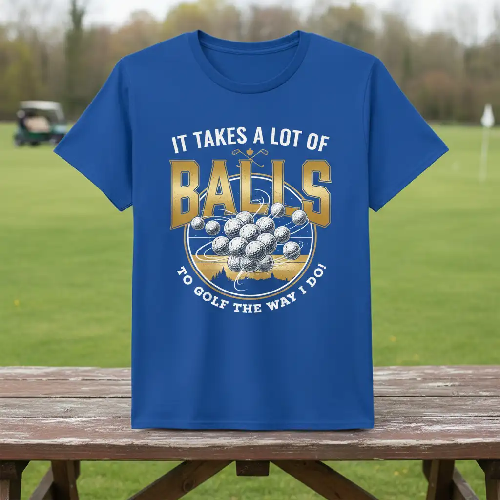 This t-shirt perfectly captures the essence of the golfing experience with its humorous and relatable slogan. The design prominently displays “IT TAKES A LOT OF BALLS TO GOLF THE WAY I DO!” in eye-catching gold lettering, making it a standout piece. The accompanying graphic features a cluster of golf balls, symbolizing the many that are often lost or used during a game, alongside crossed golf clubs, representing the sport itself.