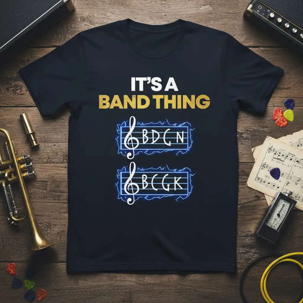 This distinctive t-shirt proudly displays the phrase “IT’S A BAND THING,” immediately signaling a shared understanding among musicians. The inclusion of “BDCN” and “BCGK” adds a layer of insider humor, likely referencing specific musical structures or common band arrangements that only band kids would recognize. It’s a subtle yet powerful nod to the community and the special bonds forged through countless rehearsals and performances.