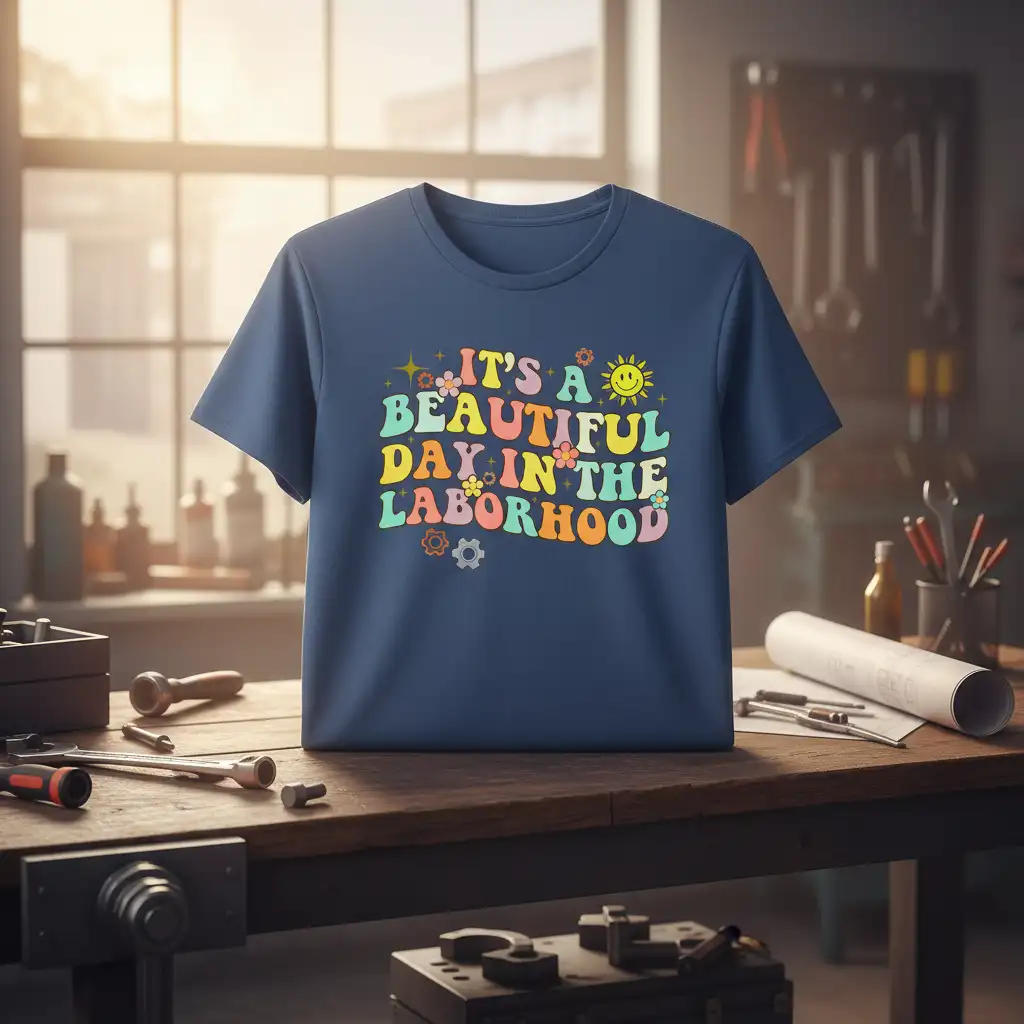 Showcase your pride in “IT’S A BEAUTIFUL DAY IN THE LABORHOOD” with this eye-catching t-shirt. It’s a comfortable and stylish way to celebrate the dedication of skilled workers. This tee makes an excellent gift for anyone who takes pride in their craft.