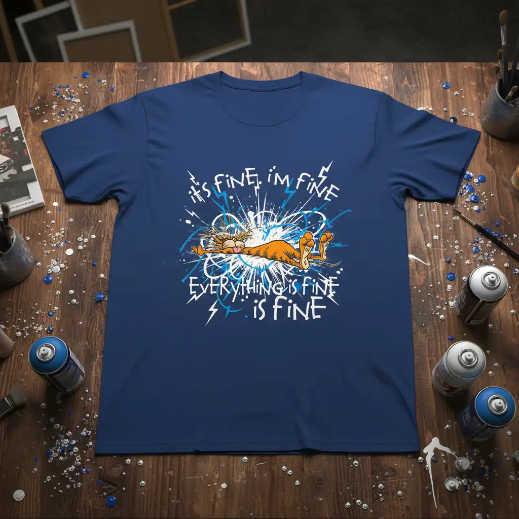 This iconic phrase, “it’s FINE, i’m FINE EVERYTHING is FINE ⚡️ is FINE,” has become a modern mantra for navigating life’s ups and downs with a dose of dark humor. The design features a hilariously distressed cartoon cat, embodying the feeling of being completely overwhelmed yet putting on a brave, albeit slightly manic, face. The energetic typography and lightning bolt accents amplify the sense of controlled chaos, making it a standout graphic tee.